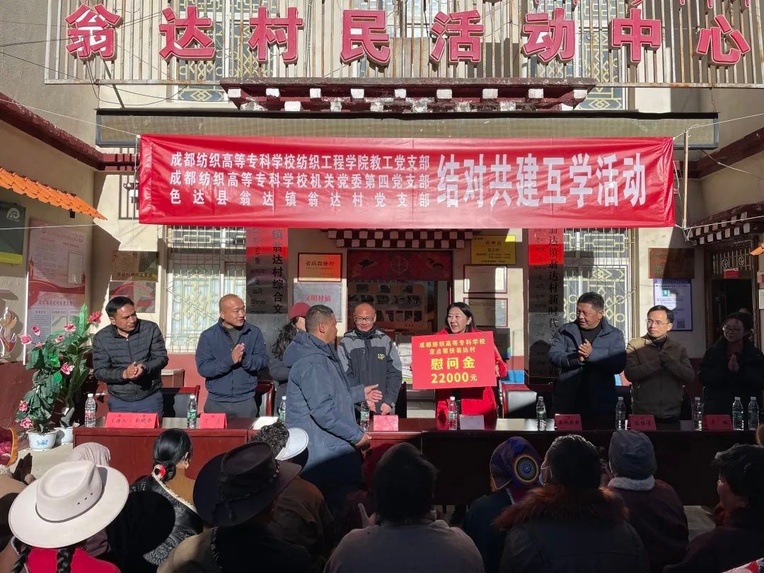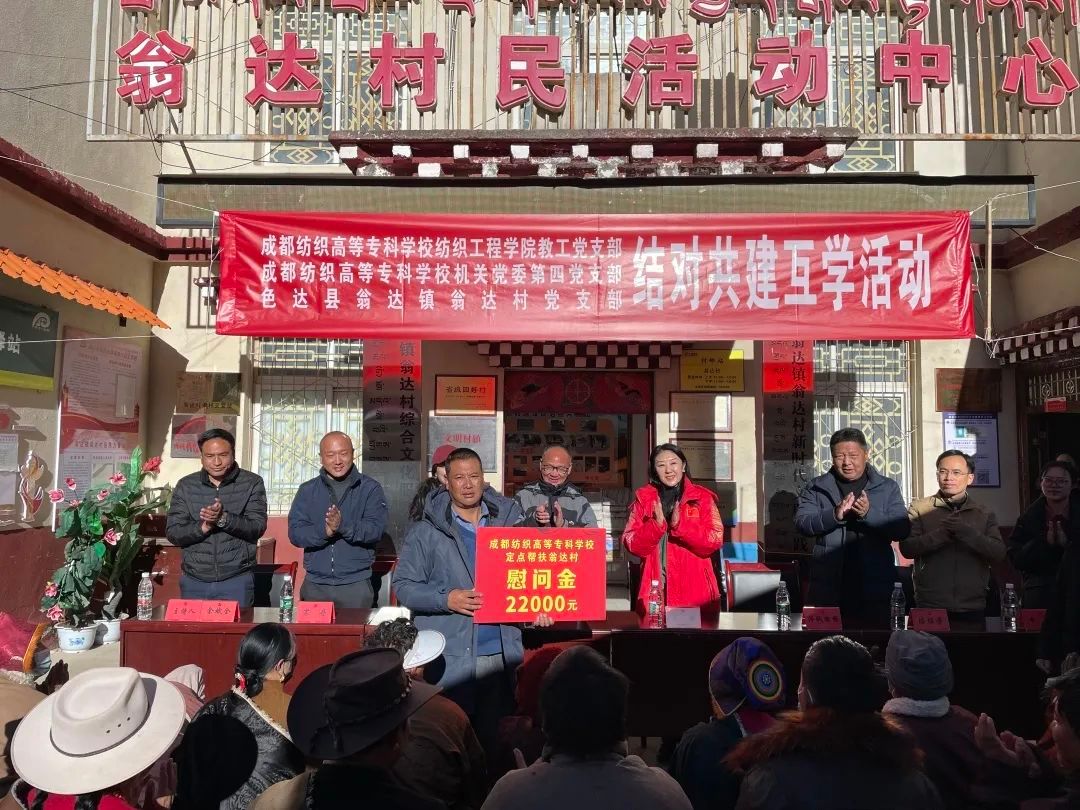 巩固拓展脱贫攻坚成果同乡村振兴有效衔接过渡期两年来,成都纺专为定点帮扶村翁达村和上甲斗村捐赠15.8万元用于两村基础设施建设、产业帮扶和人居环境改善,为困难群众捐资捐物共计62000元,捐赠220套价值44000元爱心服装,向两个村党支部发放共建共创帮扶资金4000元,为杨各乡7个行政村捐赠35台价值50000元的缝纫机;今年色达发生“8·31”新冠肺炎疫情期间,为两村捐赠10000个医用外科口罩。