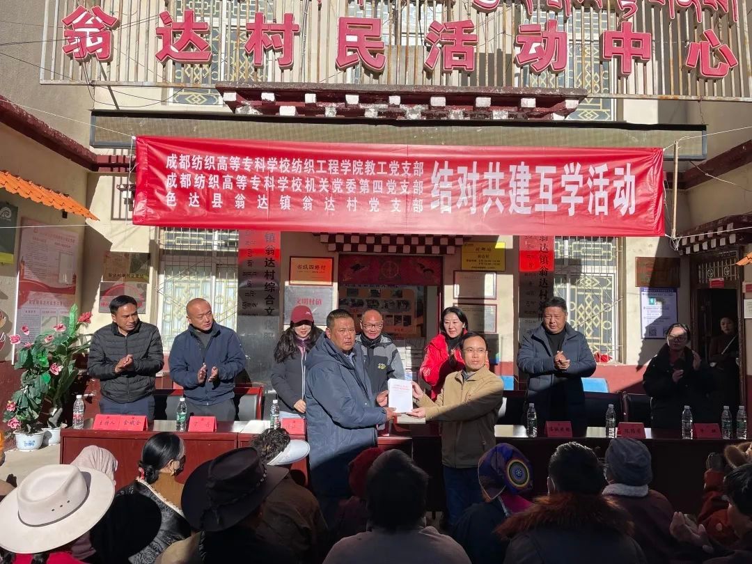 初冬时节,石静校长一行冒着寒冷一路劳顿,从平原上到高原。翁达村和上甲斗村村级活动室院坝里十分热闹。翁达镇党委和杨各乡党委主要负责同志就本乡镇开展巩固拓展脱贫攻坚成果同乡村振兴有效衔接和落实承接帮扶作了汇报。石静和学校纪委书记张江婴分别作了讲话,代表成都纺专纺织工程学院教工党支部、机关党委第四党支部和人文与通识教育学院直属党支部、机关党委第三党支部,向翁达村党支部、上甲斗村党支部颁发“党建结对共建”牌匾;成都纺专领导为两村困难群众发放慰问金40000元,向两村党支部发放党的二十大学习图书和共建共创帮扶资金4000元。