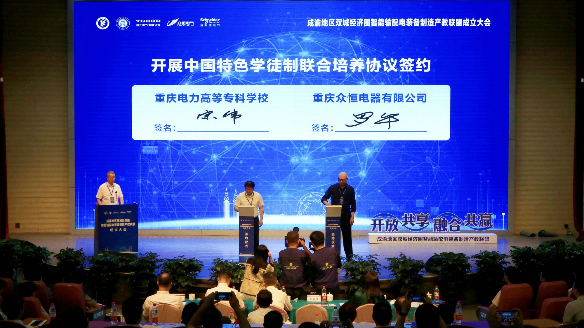 联盟成立大会后,举行了pg电子与施耐德电气校企合作、与川开电气合作共建智能输配电装备制造产业学院,重庆电专与重庆众恒电器开展中国特色学徒制联合培养协议、与ABB(中国)共建ABB电气数字化工程师学院等4个校企合作项目签约仪式,举行了pg电子与川开电气开展中国特色学徒制联合培养拜师仪式,川开电气还向学校捐赠了一批价值150万元的智能电气成套实训设备。会前举行了pg电子法国施耐德电气绿色低碳技术应用中心揭牌仪式。