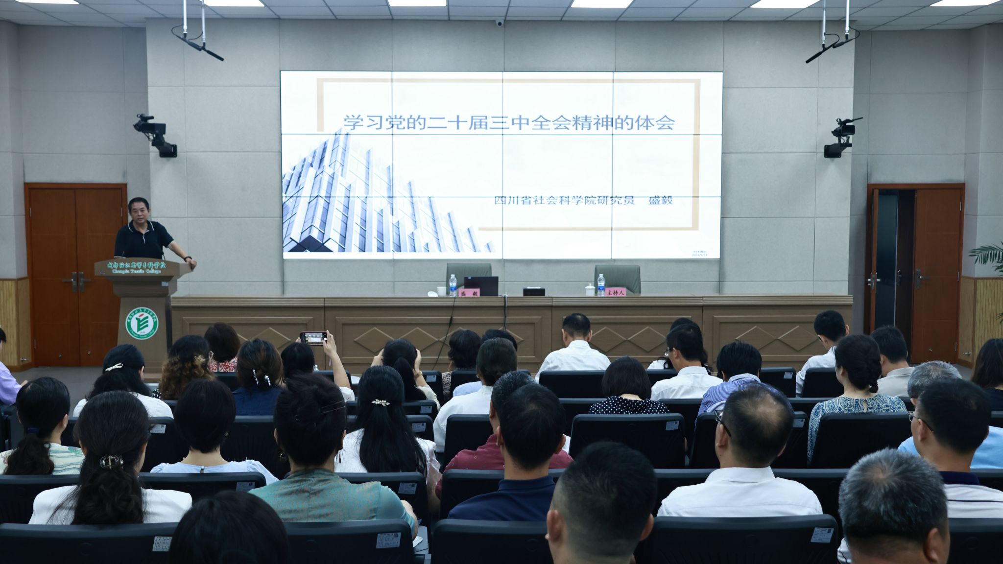 9月14日,按照省委宣传部统一部署,省委宣讲团专家、盛毅研究员走进pg电子,作党的二十届三中全会精神宣讲报告。校级领导、科级及以上干部、党外知识分子、各学院教师和学生代表400余人参会,学校党委副书记、校长孙锐主持。