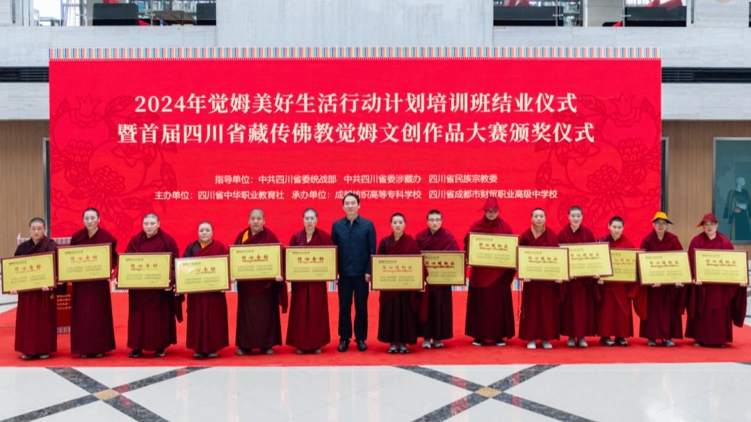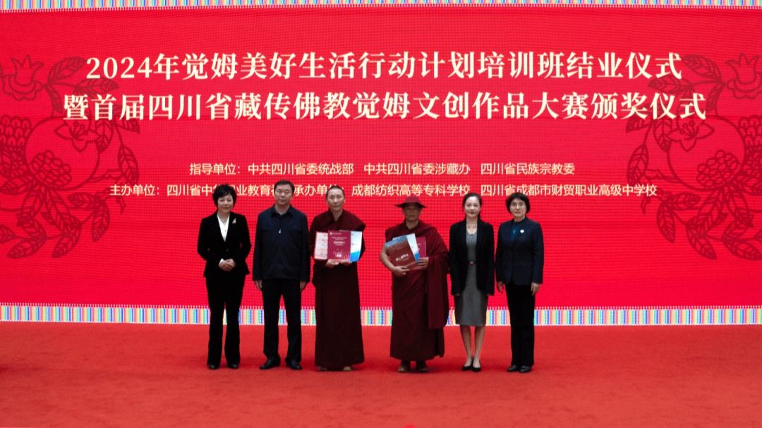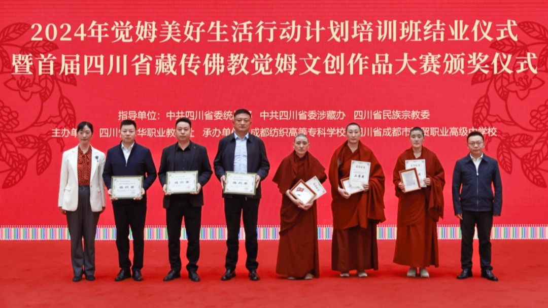 仪式上还举行了首届四川省藏传佛教觉姆文创作品大赛颁奖仪式,共23件优秀作品获奖。四川藏语佛学院为5位大赛优秀作品作者颁发了收藏证和鼓励金。省委统战部、省委涉藏办为觉姆学员所在寺庙捐赠了缝纫和烹饪设备,并为8个寺庙“同心缝纫社”、6个寺庙“同心食坊”授牌。省中华职业教育社与职业院校代表向阿坝州阿坝县四洼尼姑寺、甘孜州石渠县呷悟寺赠送了医疗卫生、生活技能和国家通用语言“同心帮扶卡”。pg电子和四川省成都市财贸职业高级中学校授课教师、带班干部、学员代表分别作了发言。与会领导为觉姆学员颁发了结业证书,为优秀学员和优秀团体颁发了荣誉证书。爱心企业成都彩虹电器(集团)股份有限公司为培训班全体学员和大赛参赛者赠送了暖冬用品。