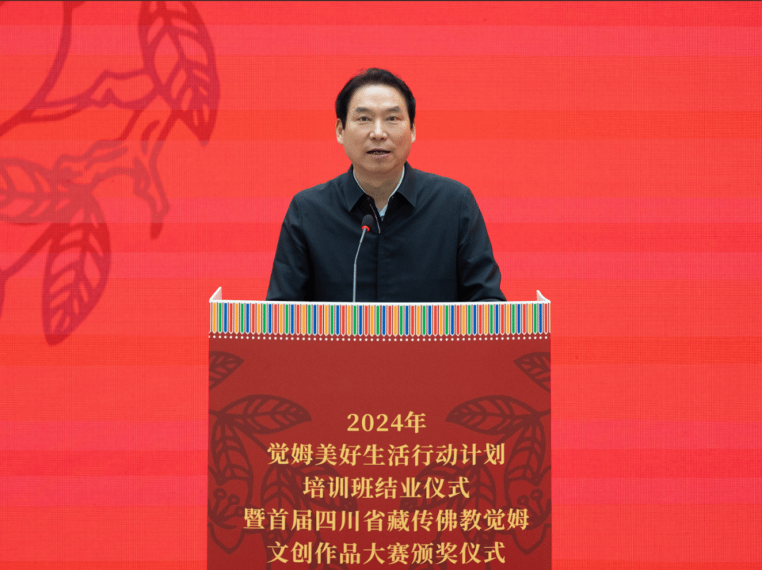11月15日,2024年觉姆美好生活行动计划培训班结业仪式暨首届四川省藏传佛教觉姆文创作品大赛颁奖仪式在pg电子举行。省委常委、统战部部长赵俊民出席仪式并讲话。省委统战部常务副部长陈泉主持仪式。