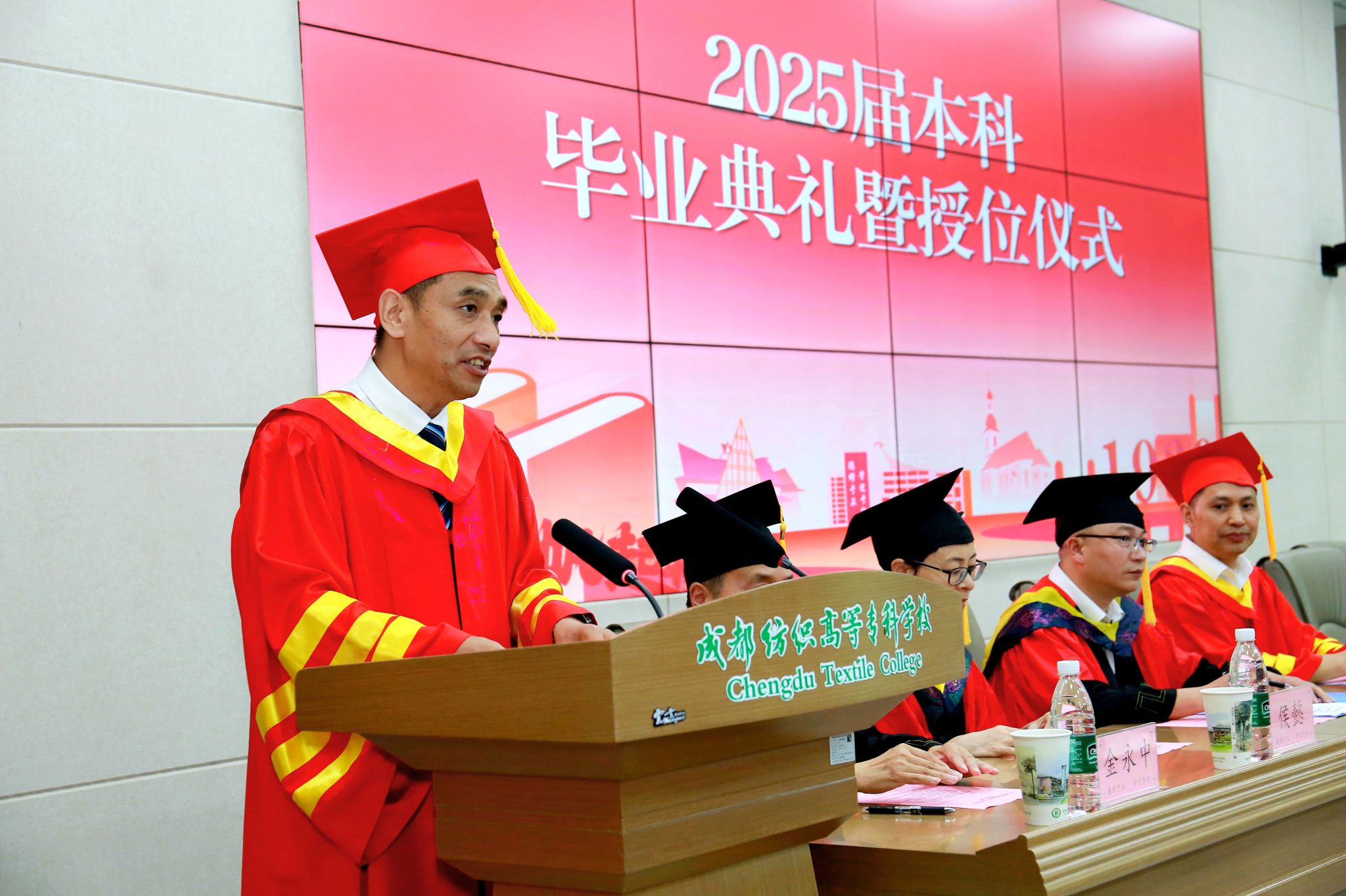 孙锐代表学校党委书记任迎伟和全体师生向138名本科毕业生致以热烈祝贺,并以“立心”“笃行”“致远”三个关键词深情寄语,鼓励同学们一要“立心”,在时代洪流中铸就精神坐标。身处科技革命重塑纺织业的时代洪流,大家要把握国家战略机遇,以“干一行爱一行”的定力,将“小我”融入国家“大我”,将个人成长融入高质量发展蓝图;秉持“十年磨一剑”的坚守,在专业领域深耕细作。二要“笃行”,于荆棘征途上淬炼破局锋芒。前路或许充满挑战,大家要“笃行”实干,践行校训“德修于正·学究于行”:既要掌握数字化硬实力,也要锤炼不可替代的匠心;勇于跳出舒适圈,学习前辈攻坚“卡脖子”技术的毅力,效仿学长学姐深入新疆棉纺基地、云南非遗工坊的担当,以“德”守底线,以“学”探创新,用行动诠释“行胜于言”。三要“致远”,在星辰大海间成就卓越人生。“致远”之路,是与时代同频的格局觉醒,是向未来进发的永恒姿态。大家要将个人理想融入国家命运、于时代浪潮中实现人生价值,在中国式现代化征程上,既深耕脚下的创新沃土,更眺望人类共同命运的浩瀚星空。