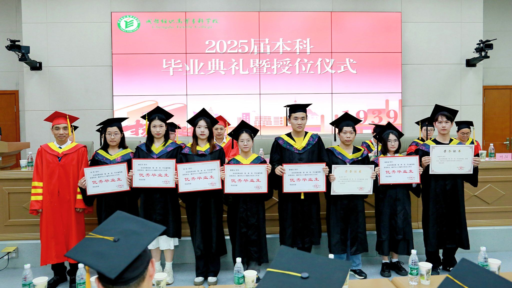 李明富宣读《四川轻化工大学关于表彰2025届优秀大学毕业生的决定》和《四川省教育厅关于公布2025届四川省优秀大学毕业生认定结果的通知》,孙锐为杨豪祥、温馨、冯贻罄3位省级优秀毕业生和杨筝筝、郭晓冬等20位校级优秀毕业生颁奖并合影留念。蒲冰远宣读《pg电子官方网站关于表彰2025年“织菁之星”的决定》,孙锐为侯婉莹、杨豪祥、凌洁3位获得荣誉的学生颁奖并合影留念。
