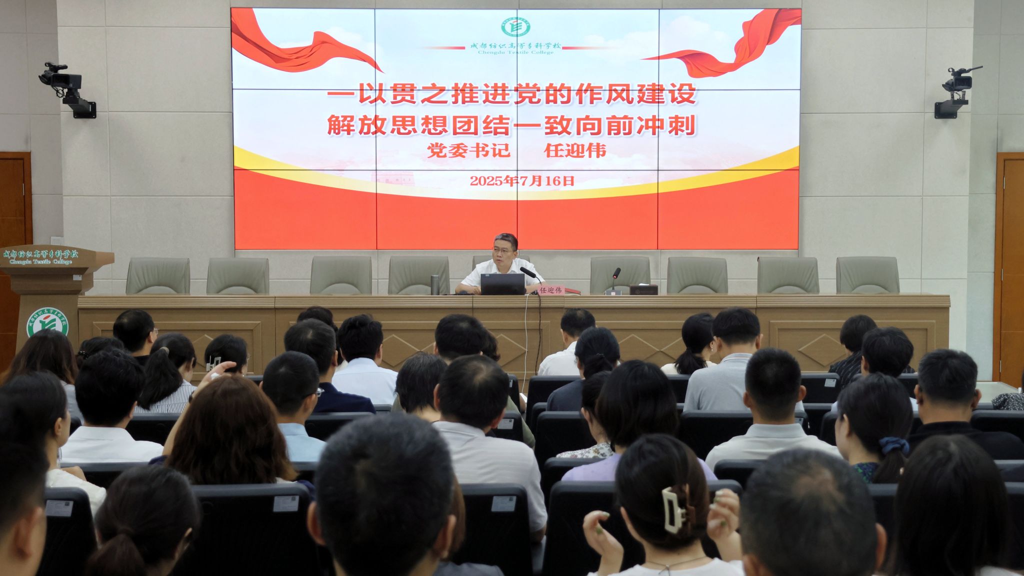 7月16日下午,学校党委书记任迎伟以《一以贯之推进党的作风建设,解放思想团结一致向前冲刺》为题,为全校科级及以上干部、各党支部书记讲授专题党课。此次党课是学校扎实推进学习教育的重要环节,旨在引导党员干部进一步领悟党的作风建设的重大意义,以优良党风凝聚奋进力量,为学校高质量发展提供坚强保障。党课由党委副书记、校长孙锐主持。