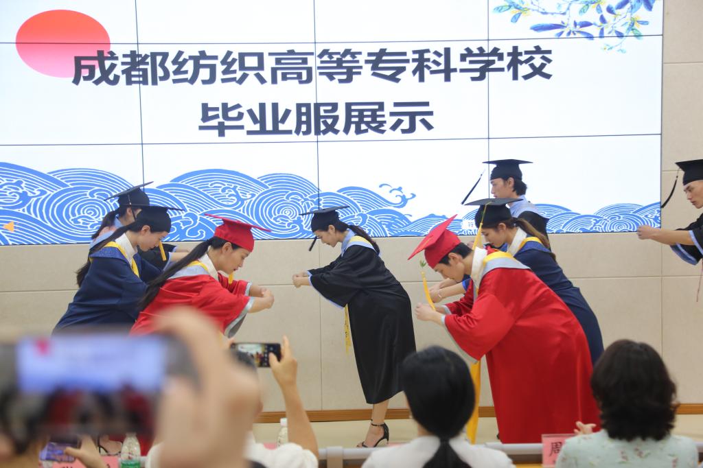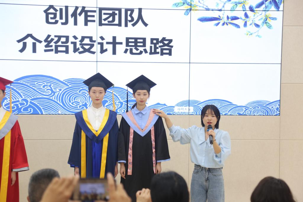 2019年《国家职业教育改革实施方案》和2022年开始实施的新《职业教育法》都明确指出“职业教育与普通教育是两种不同教育类型,具有同等重要地位”。作为具有83年办学历史、服务纺织服装产业的职业院校,作为全国普通高校中华优秀传统文化传承基地、中国纺织服装高技能人才培训基地,学校师生在建设中国特色高水平高职学校和专业群的过程中,敏锐地意识到,应该勇担使命,为中国职业院校设计定制自己的毕业服,填补国内空白。