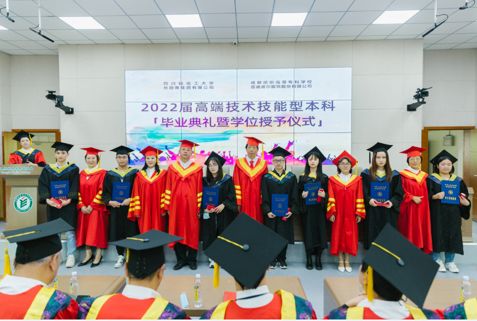 2022届高端技术技能型本科学生由pg电子与四川轻化工大学、雷迪波尔服饰股份有限公司、宜宾丝丽雅集团有限公司联合培养。川轻化党委常委、副校长颜杰,pg电子党委书记蔡玉波和党委副书记、校长石静,丝丽雅集团人力资源部经理李润梅,雷迪波尔副总裁张斗出席毕业典礼,共同见证2022届学子成长蜕变的重要时刻。毕业典礼由学校党委副书记周红主持。