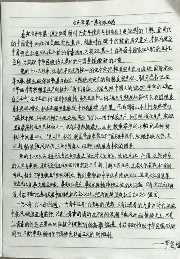 电信学院电气221曹洪志:今天观“开学第一课”,我从中看到了当代就业的困难、家教的重要,以及每一碗米饭的来之不易。尽管三年后可能就业十分困难,但我依旧相信“是金子总会发光”这个道理,而且党和国家也在积极地为我们这些大学生争取就业的机会,所以活在当下还应努力学习。用朋友们的话来说,我是一个特别好相处的人,跟谁都合得来,这是因为父母为人处世的耳濡目染,让我的格局得到了提升,由此可见良好家教的重要性。记忆中和蔼可亲的爷爷奶奶因为我浪费米饭而生气的往事,让我对总书记格外关心国家粮食安全产生了强烈共鸣。初入大学,看了“开学第一课”我感触良多,最深的无疑是这三点。今后的故事还很长,现在能做的,就先从努力学习、爱惜粮食开始吧!
