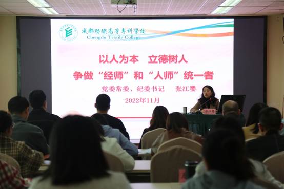 开班仪式后,张江婴书记以《“以人为本,立德树人,争做“经师”和“人师”统一者》为题,作师德师风专题讲座。她带领教师们深入学习党的二十大报告中关于教育的重要论述,分享古人师德传统中的精神养分,并以详实的案例讲解,教育引导教师们准确把握师德师风建设要求。她希望教师们:要始终忠诚党的教育事业,做到教育者先受教育、示范者率先垂范,处理好八小时内外关系、师生关系和个人与集体的关系,以德立身、以德立学、以德施教、以德育德,为培养德智体美劳全面发展的社会主义建设者和接班人,为学校职教本科建设而踔厉前行。