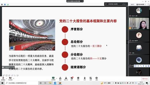 11月21日,创艺学院通过腾讯会议在线举行党的二十大精神学习会,学习会由马克思主义学院向真真老师主讲,学院2023届全体毕业生参加学习。