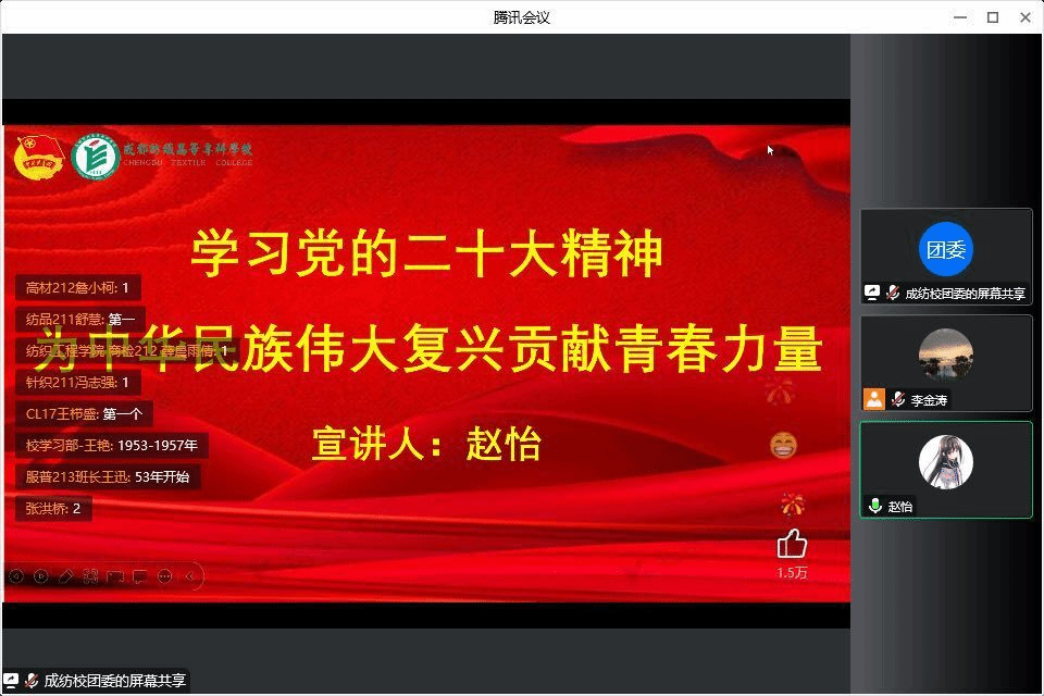 12月7日晚,校团委59期“青马工程”后备干部培训班最后一次课程顺利结束。本次课程邀请团中央党的二十大精神宣讲团成员、中共四川省委宣讲团新时代文明实践青年宣讲分团成员、共青团四川省委四川省青少年研究与发展中心干部赵怡作宣讲,全校青马工程班学员和部分宿舍团小组成员600多人在线上参加学习。