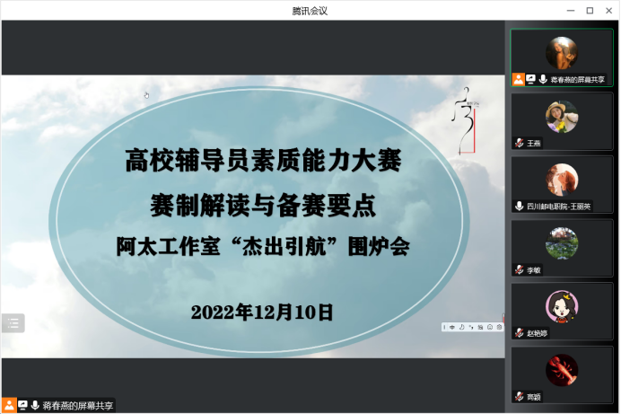 12月10日晚,学校阿太工作室召开“杰出引航”围炉会,第八届全国高校辅导员素质能力大赛一等奖获得者、四川邮电职业技术学院专职辅导员王丽英副研究员应邀在腾讯会议为pg电子辅导员作“高校辅导员素质能力大赛赛制解读与备赛要点”专题培训。