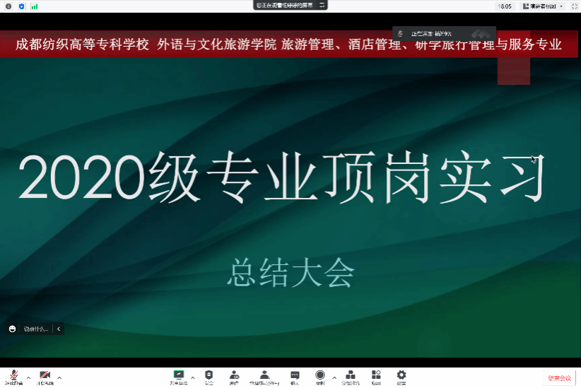 12月9日,外语与文化旅游学院在线上召开2020级旅游管理、酒店管理与数字化运营、研学旅行管理与服务三个专业的顶岗实习总结大会,学院党总书记樊廷友、副院长王敏、梁金柱和旅游教研室全体教师、2020级全体学生参会,会议由旅游教研室主任杨婷婷主持。