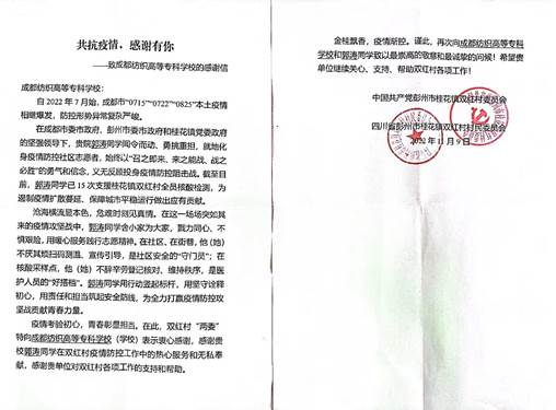 2022年12月,智造学院收到彭州市桂花镇双红村村委会的一封感谢信。信中,双红村“两委”对pg电子表示衷心感谢,感谢智造学院机设202班郭涛同学在疫情防控工作中的热心服务和无私奉献。以下是全文内容: