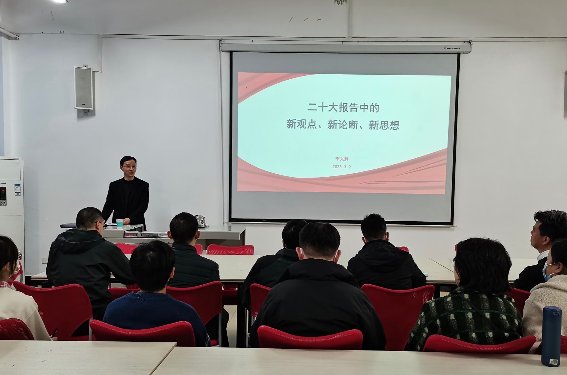 2023年是学习宣传贯彻党的二十大精神的开局之年。3月7日,纺织工程学院开展《二十大报告中的新观点、新论断、新思想》专题党课学习,人文与通识教育学院直属党支部书记李光胜应邀主讲,纺织学院党总支书记谭林主持会议,学院教工党支部、学生党支部全体党员参加学习。