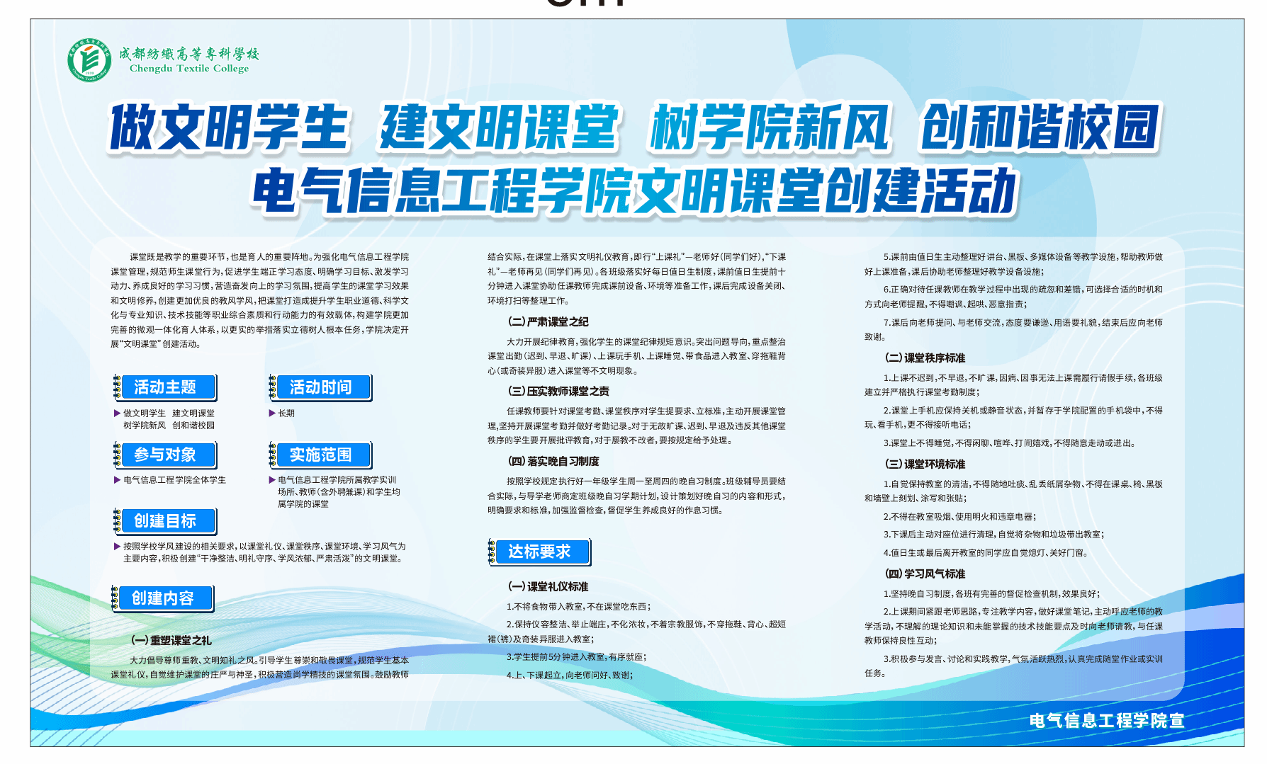 日前,电气信息工程学院出台《电气信息工程学院关于创建文明课堂的工作方案》,正式启动主题为“做文明学生、建文明课堂、树学院新风、创和谐校园”的文明课堂创建工作。