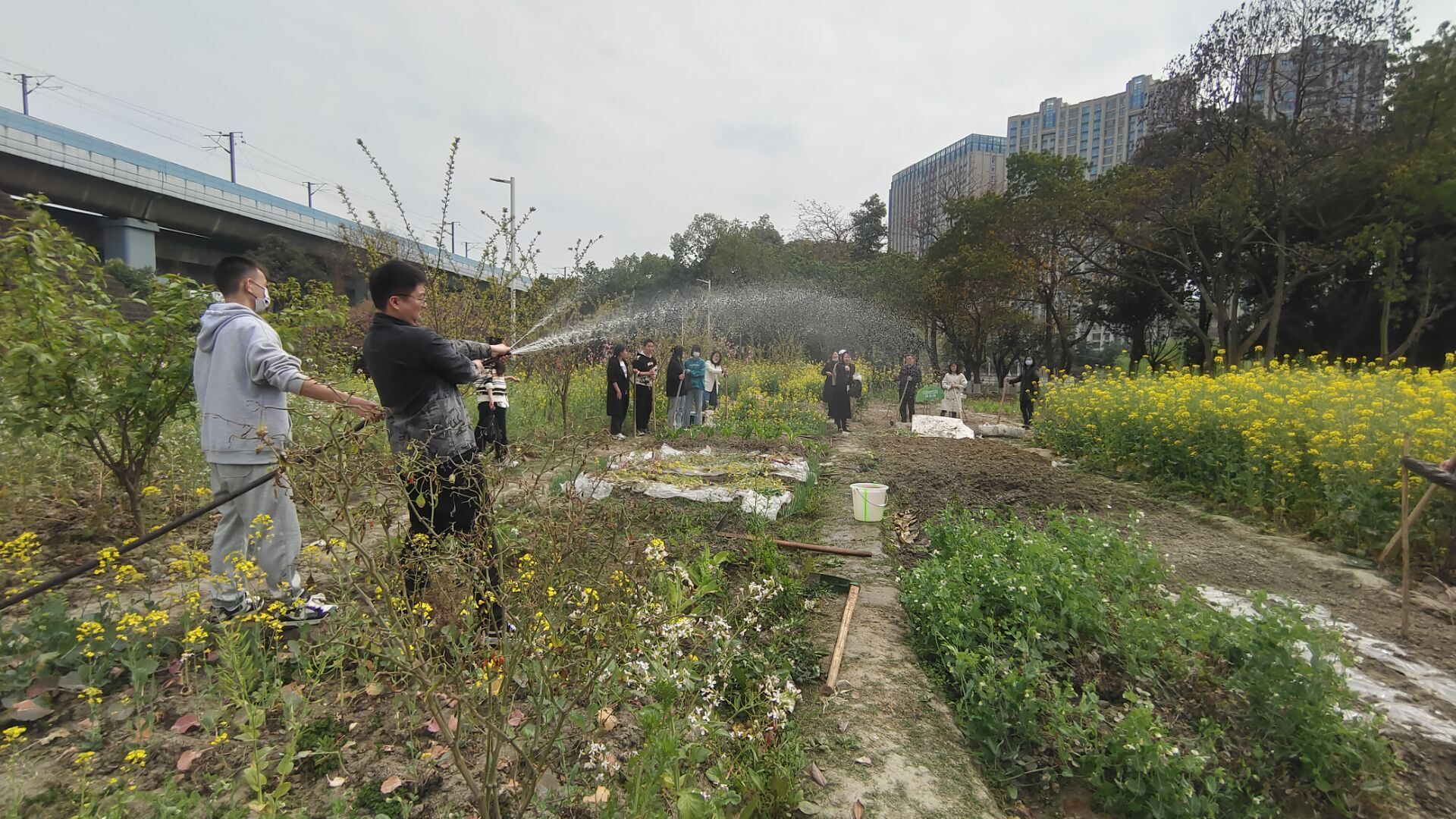 活动在创艺学院党总支负责的耕地上开展。师生党员干劲十足,齐心协力,除草、松土、挖坑、播种、浇水、盖土一气呵成。劳动过程中,师生共同体会到劳动的光荣与乐趣、艰辛与不易。望着新播下花生的土地,大家脸上都充满了幸福与期待。
