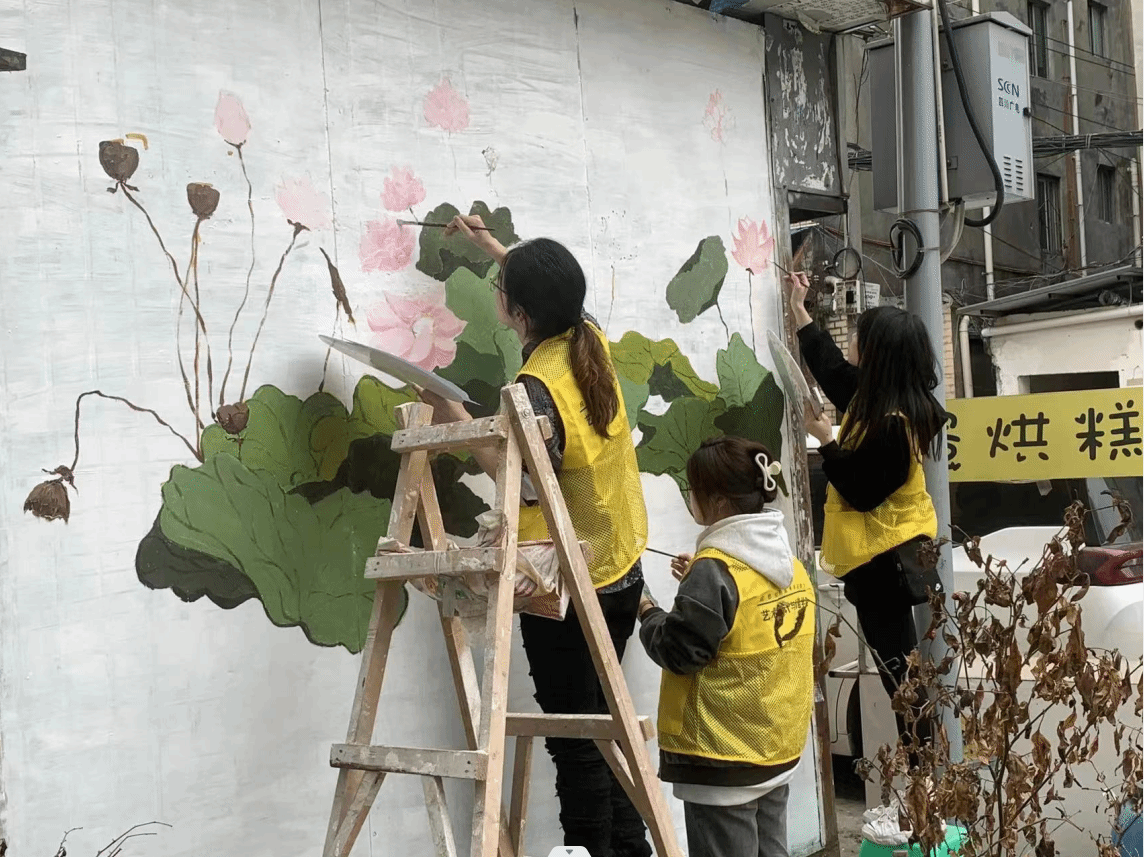 本次墙绘图样由学院和社区共同创作而成,内容为莲花荷叶,寓意着清廉纯净、和睦团结。项目实施过程中,志愿者们分工协作,清理墙面、勾画轮廓、配色、上色、处理细节,大家挥舞手中的画笔,在空白的墙上绘画出色彩艳丽、形象生动的荷花。经过一个周末的忙碌,让原本老旧的墙面“焕然一新”,构成一道靓丽的风景线,吸引社区居民纷纷驻足观赏。