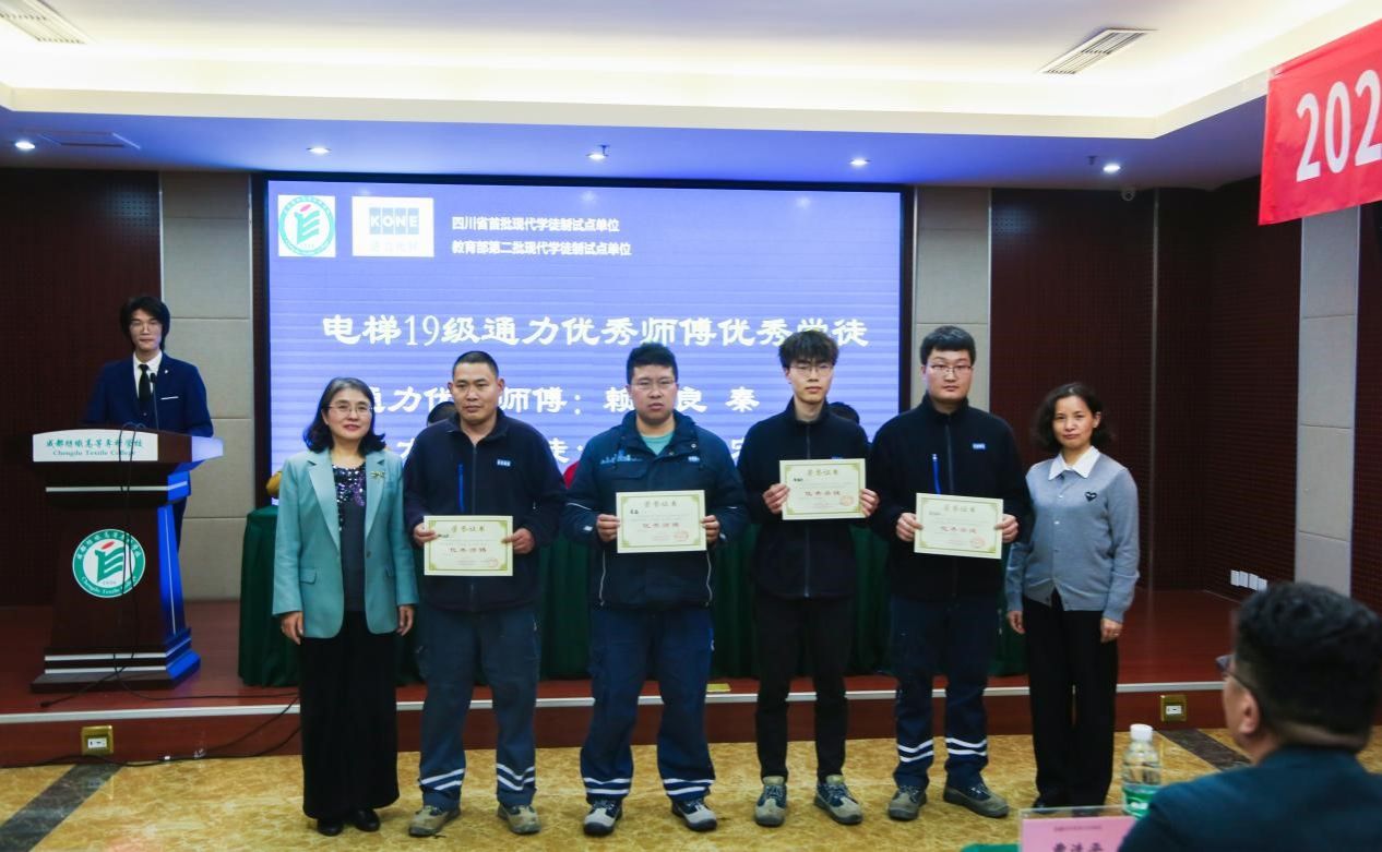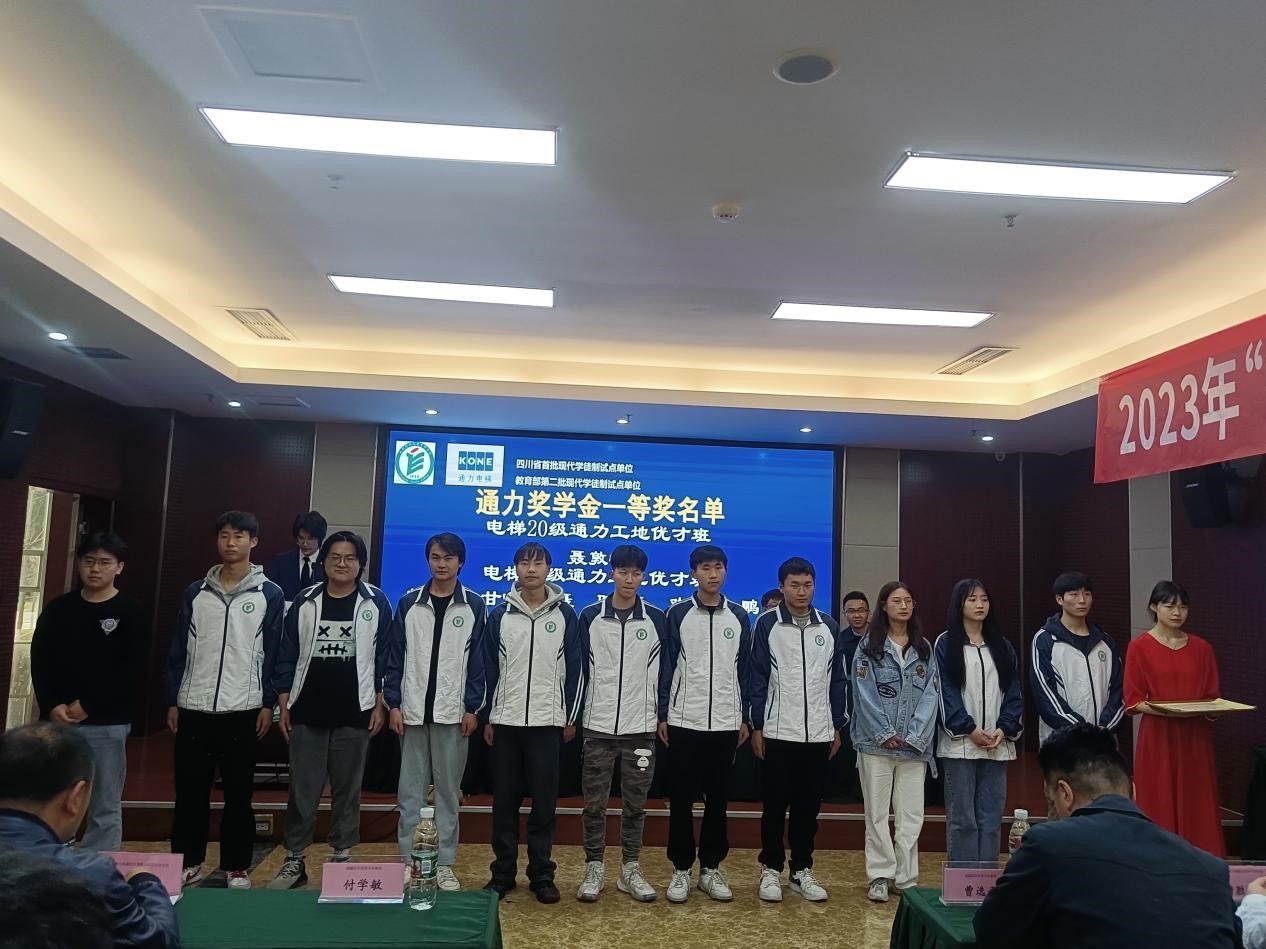 随后进行通力奖学金、通力优秀师傅和优秀学徒的颁奖。电梯工程技术201班(大三)与211班(大二)多名学生获得通力奖学金。通力公司赖旭良、秦磊获优秀师傅奖,周海东、宋怀印获优秀学徒奖。