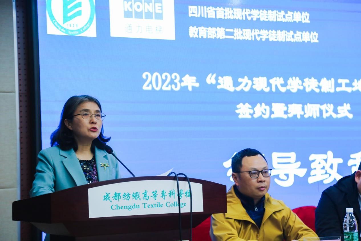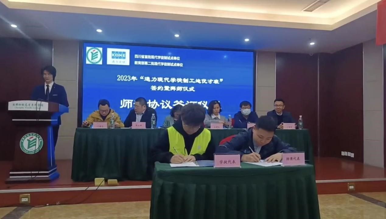 紧接着,在众多领导和嘉宾见证下,师傅代表李星霖和学生代表任文龙签订“通力现代学徒制工地优才班”校企师徒协议。李星霖代表新一届带教师傅发言讲道,自己就是成都纺专毕业的学生,通过踏实工作、积极进取,现在也当上了师傅;在今后的学习生活中,一定会对学徒倾囊相授。朱婷代表全体拜师学徒发言,感谢学校、企业提供的宝贵学习平台,表示在今后的学习中将更加刻苦,学出成绩,争取早日进入通力岗位。