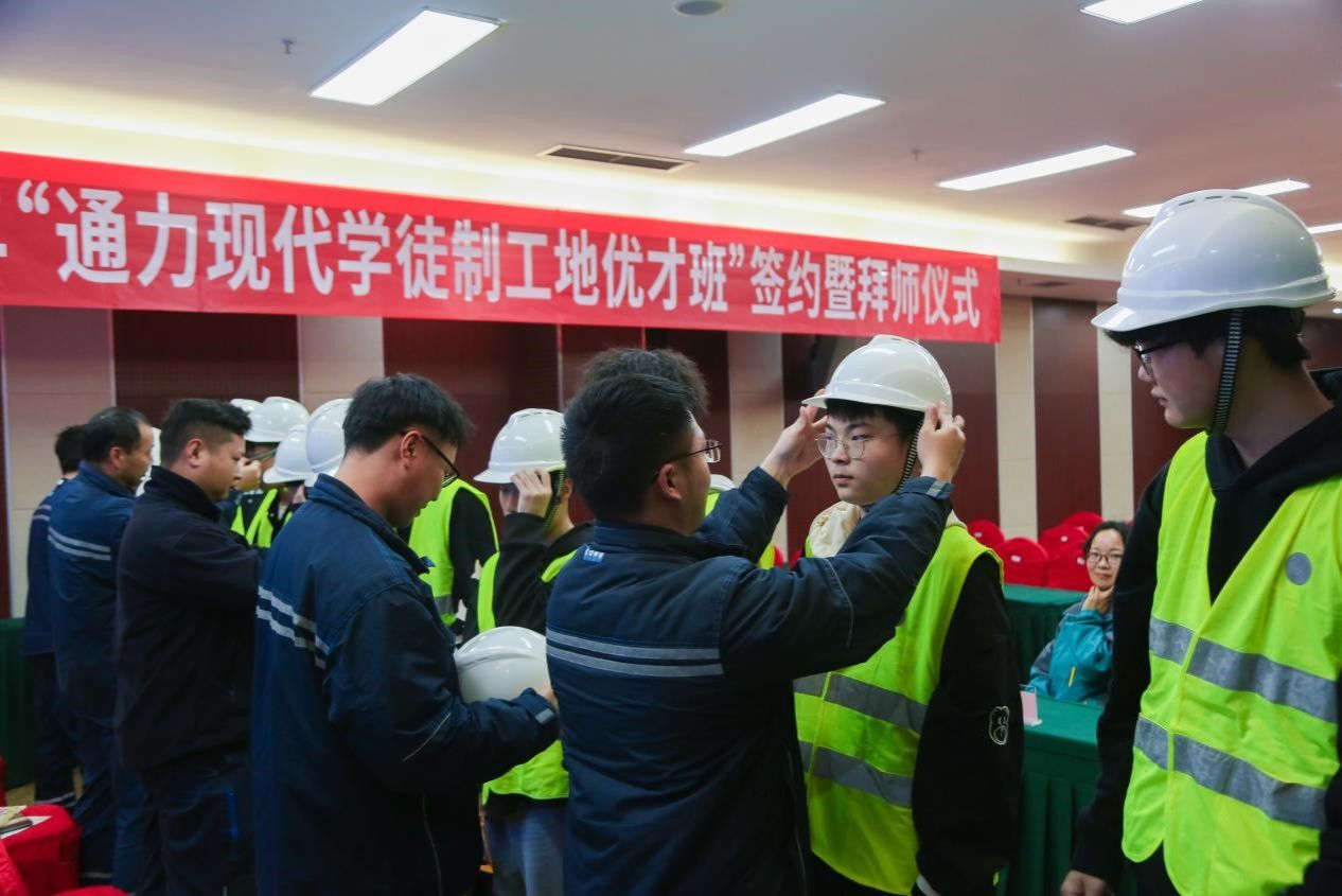 在最后的拜师仪式上,电梯工程技术221班全体同学在庄重的气氛中,郑重地向通力电梯有限公司师傅鞠躬问候,呈拜师帖,师徒互赠小礼物,师傅细心地为徒弟佩戴安全帽,表达深情关怀和殷切期望。