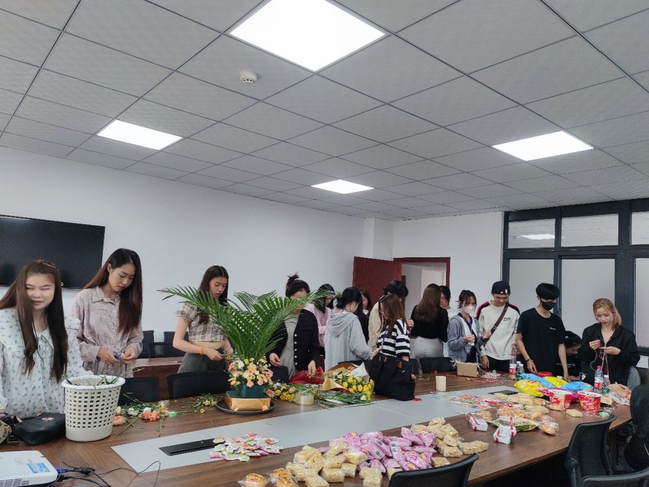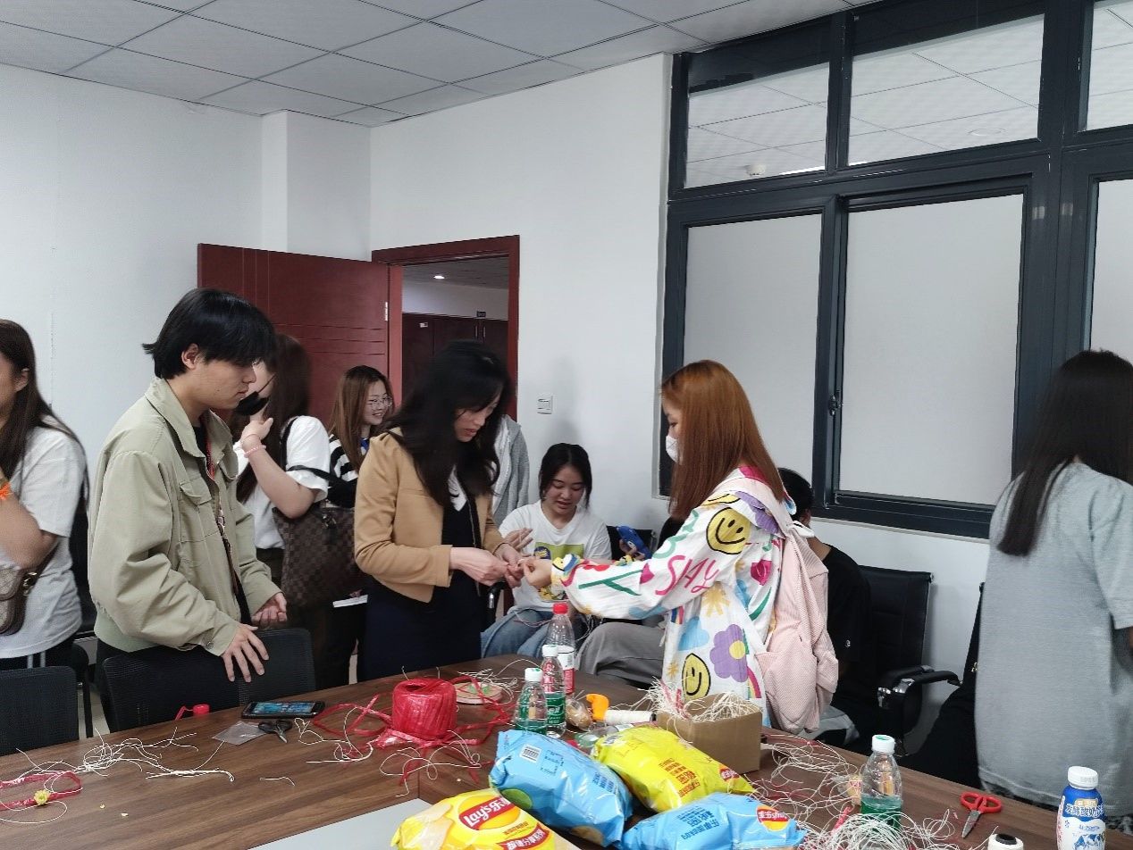 活动前,中国师生们还与留学生们一起做新年准备活动,插花、编手绳线等,其乐融融。