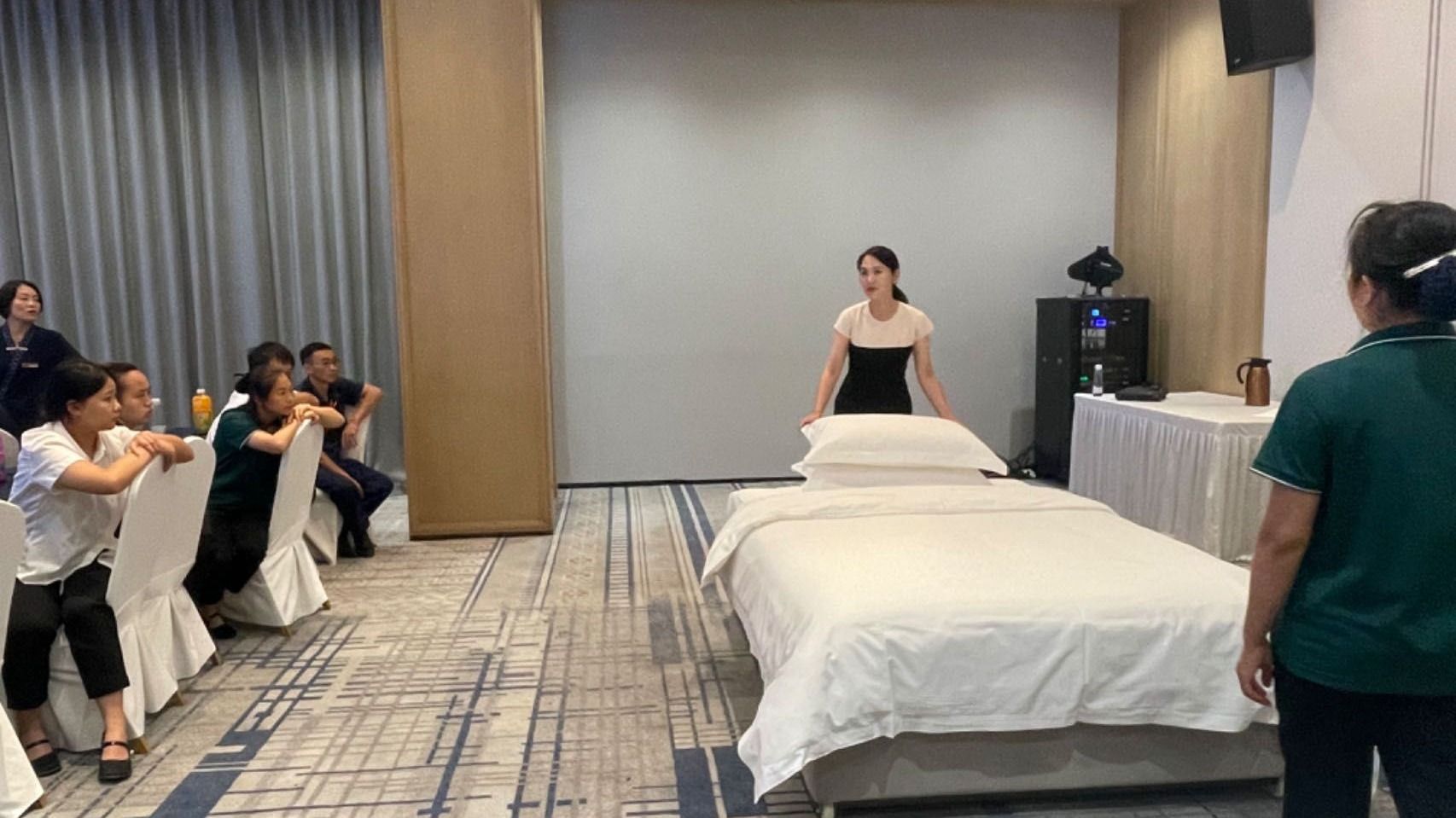 在客房服务培训中,杨老师重点讲解了客房清洁、整理以及客房设施的使用和维护等知识。她强调,客房是顾客在酒店中停留时间最长的区域,因此客房服务的品质直接关系到顾客的整体体验。通过现场演示和互动教学,员工们掌握了客房服务的标准流程,学会了如何根据顾客的不同需求提供个性化的服务。