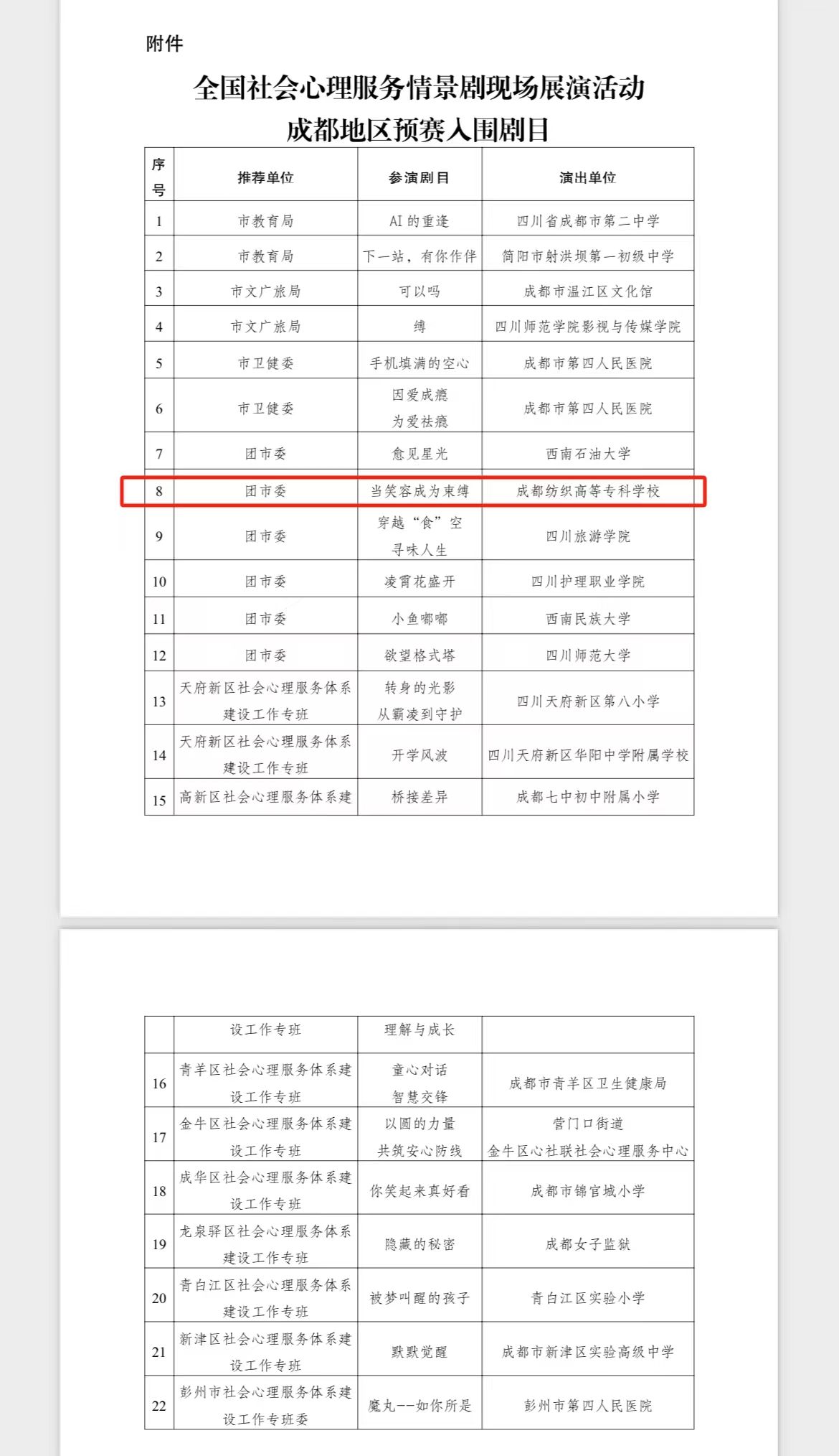 该剧是我院“安住心理”辅导员工作室原创作品,已入围全国社会心理服务情景剧现场展演活动成都地区预赛剧目,稍后将代表学校参加10月15日的现场展演活动。