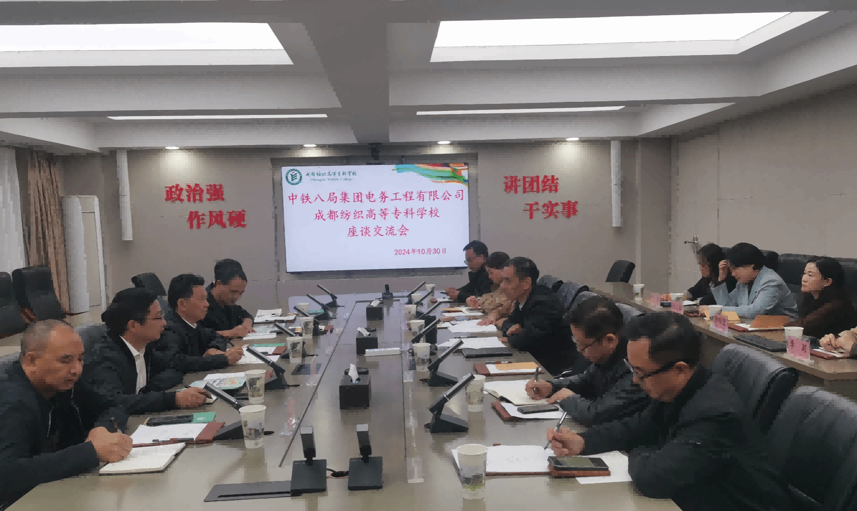10月30日下午,中铁八局集团电务工程有限公司总工程师胡基冬、人力资源部部长蒲元明、工程部部长晏贵章、科学与技术管理部副部长汪建清、地铁维保项目部书记李天才一行5人来校调研交流。学校校长孙锐,副校长吴越,教务处、科技处、学创处、产教交流处、智造学院、建环学院、电信学院等相关职能部门负责人参加了座谈会。