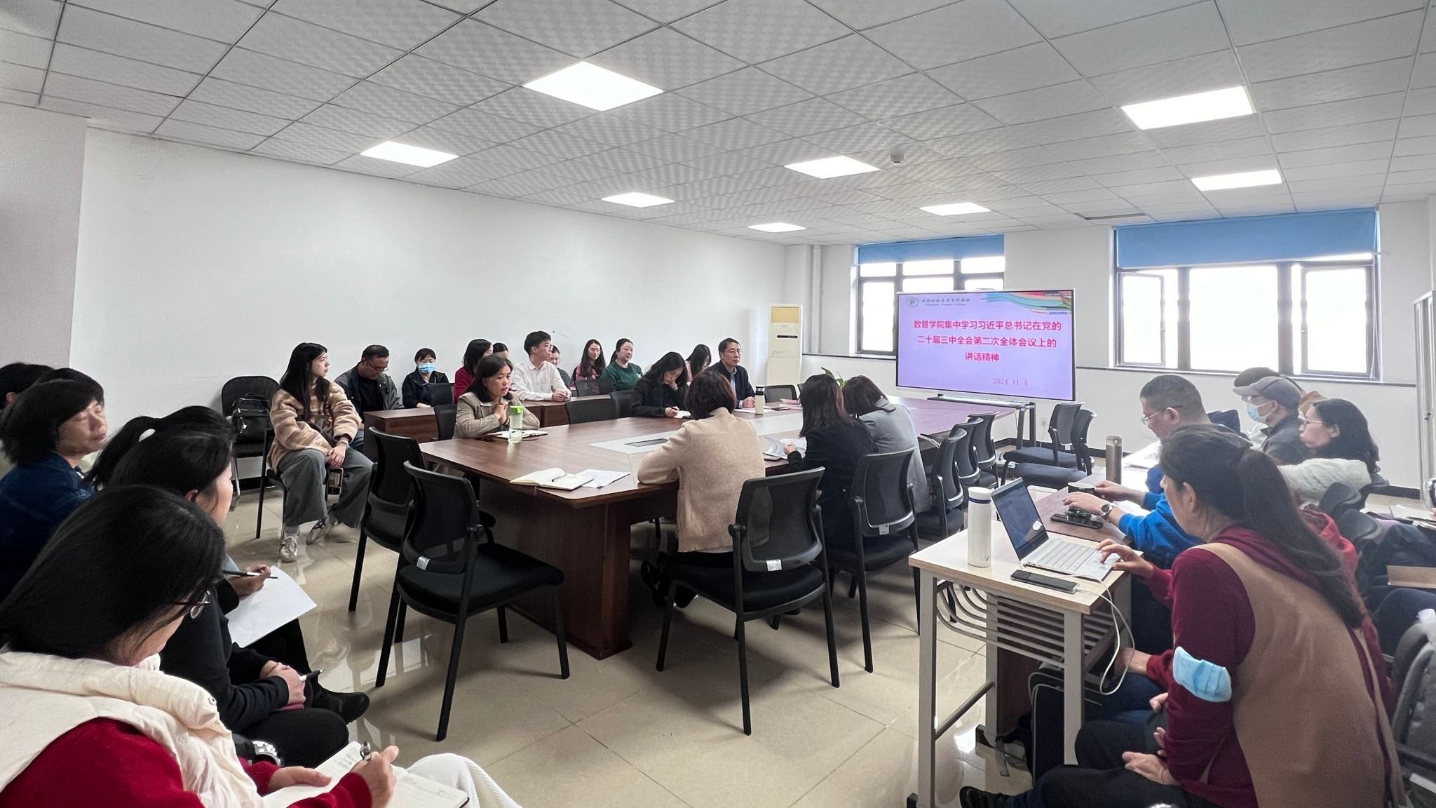 11月5日,数管学院召开专题学习会,集中学习习近平总书记在党的二十届三中全会第二次全体会议上的讲话,深入领会习近平总书记讲话精神。会议由学院党总支书记王霖主持,全体教师参加。