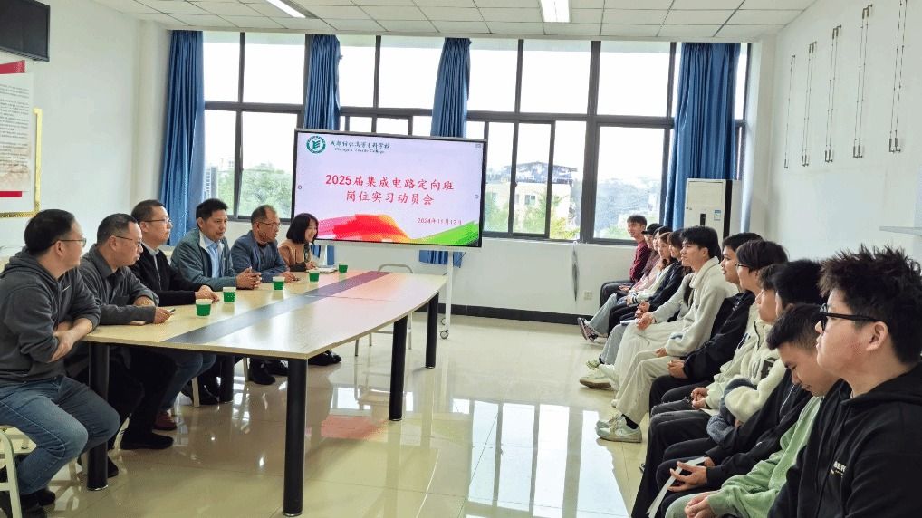 11月12日上午,pg电子在北苑笃行苑C410教室隆重举行2025届、也是成纺首个集成电路定向班同学的岗位实习出征仪式。副校长蒲冰远作动员讲话。轻材学院党总支书记申昕、电信学院党总支书记姚玲峰、学创处副处长刁家志、智造学院党总支副书记李敏和2025届集成电路定向班师生参加活动。