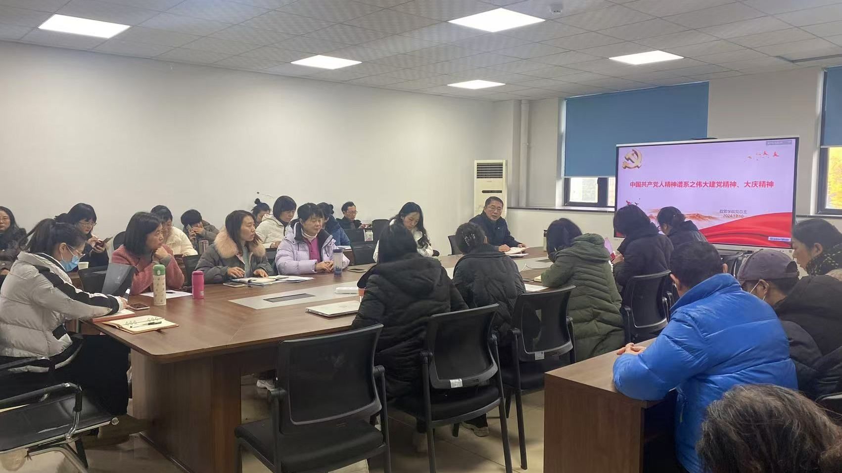 12月10日下午,数管学院在北苑融创楼A402召开中国共产党人的精神谱系学习会,学习伟大建党精神、大庆精神。会议由学院党总支书记王霖主持,全体教师参加。
