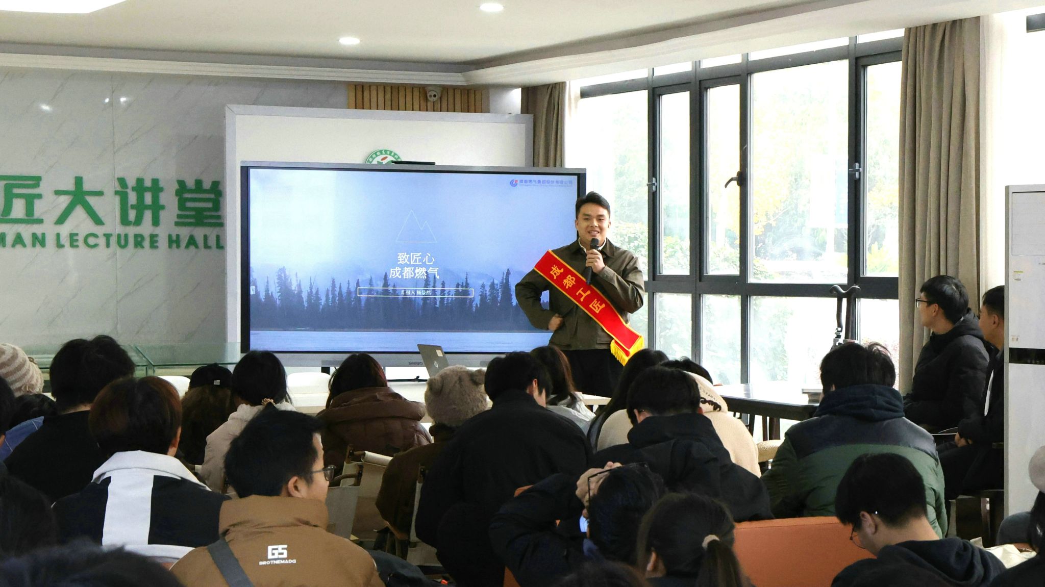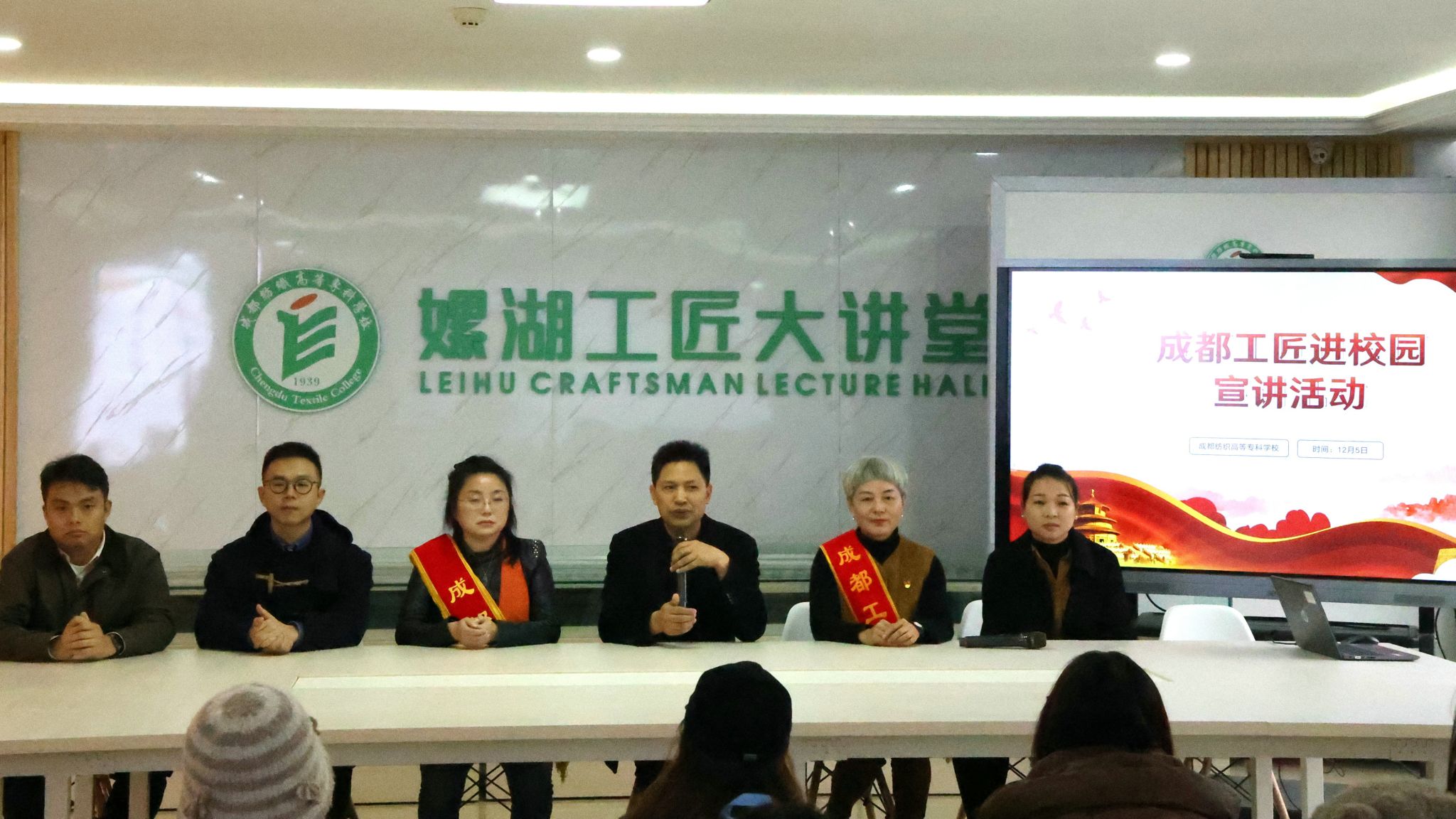12月5日上午,在成都市总工会的大力支持下,张芸、肖亚东、杨景然、袁红燕4名成都工匠走进pg电子,在“一站式”社区工匠嫘湖大讲堂举行宣讲活动。pg电子党委常委、副校长蒲冰远出席,学创处、团委相关人员和100余名学生参加活动。活动由学创处负责人杨舜如主持。