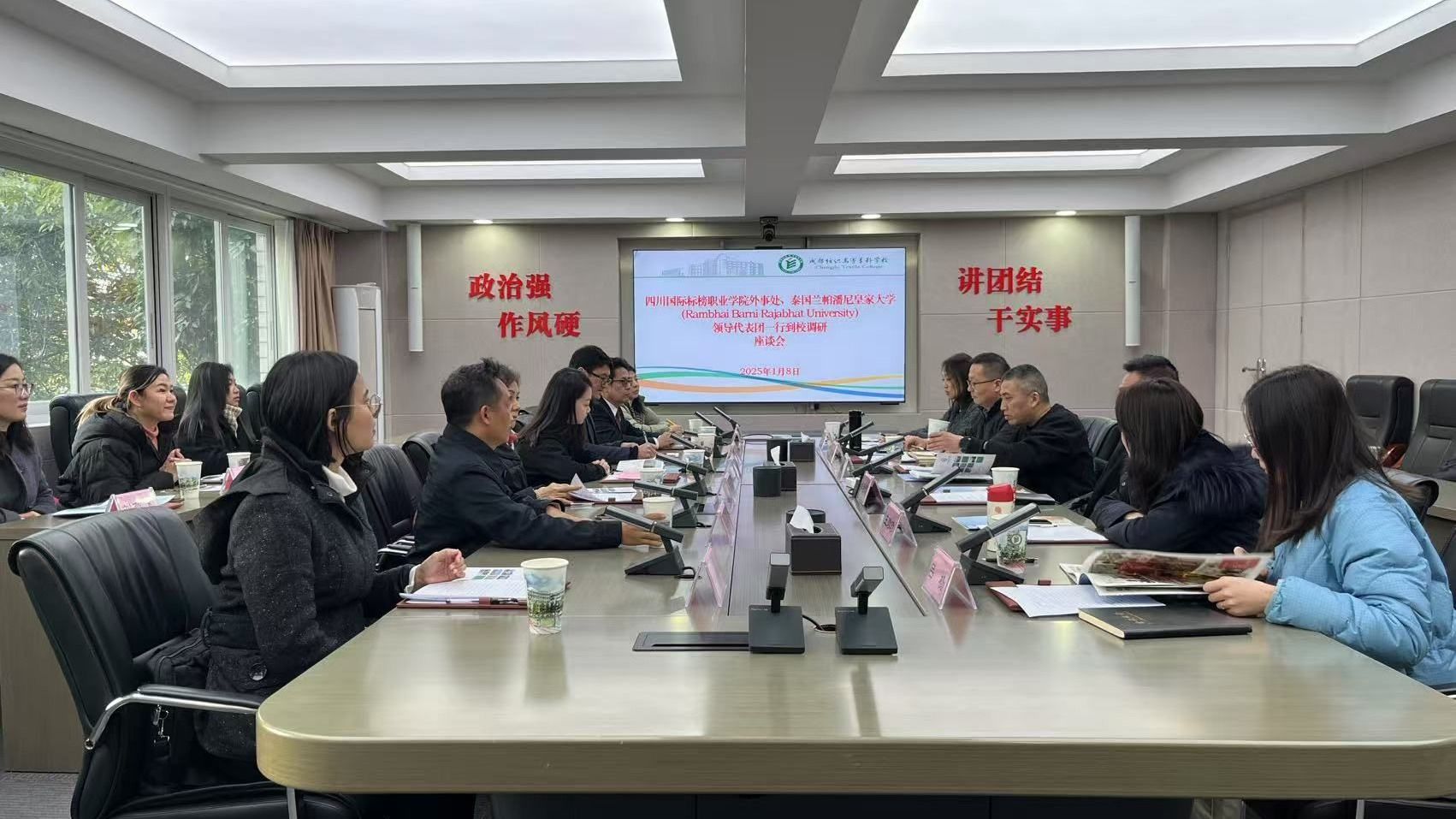 1月8日下午,泰国兰帕潘尼皇家大学(以下简称RBRU)代表团在四川国际标榜职业学院外事处陪同下来校,就师生国际交流、专升本合作等项目进行交流座谈。