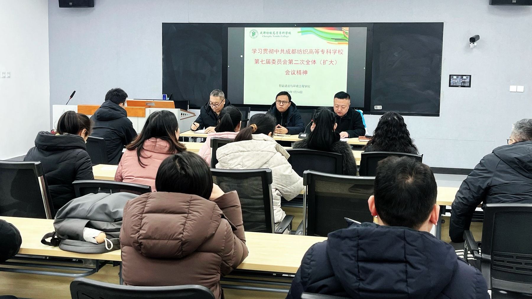 1月14日,智能建造与环境工程学院在行知楼A306召开教职工大会,集中学习中共pg电子官方网站第七届委员会第二次全体(扩大)会议精神。党总支副书记(主持工作)鲜金宏领学党委书记任迎伟作的《深入贯彻落实党的二十届三中全会精神 全力冲刺建成职教本科促推学校高质量发展》工作报告。