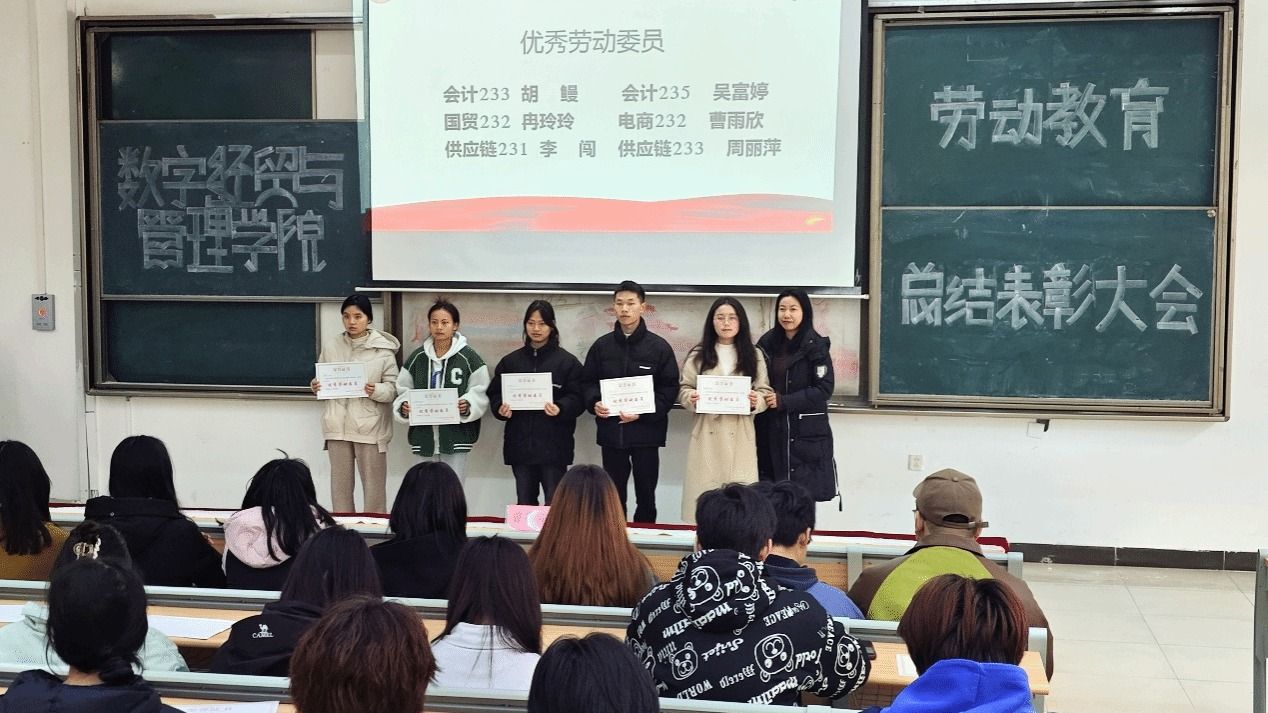曾老师为获得“劳动教育优秀班集体”“劳动之星”“优秀劳动委员”等荣誉的班级及个人进行颁奖。优秀获奖代表、供应链233班刘彩凤在发言中分享了她在劳动实践中的心得体会:“通过劳动实践,不仅锻炼了自己的动手能力,也培养了团队合作精神和吃苦耐劳的品质,今后将继续发扬劳动精神,争做新时代的奋进者。”