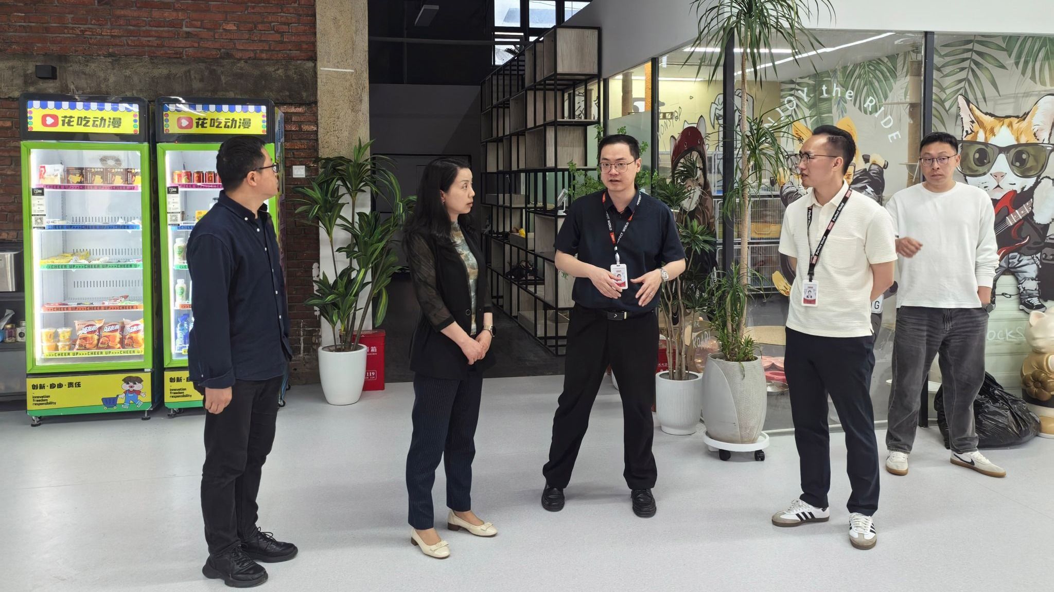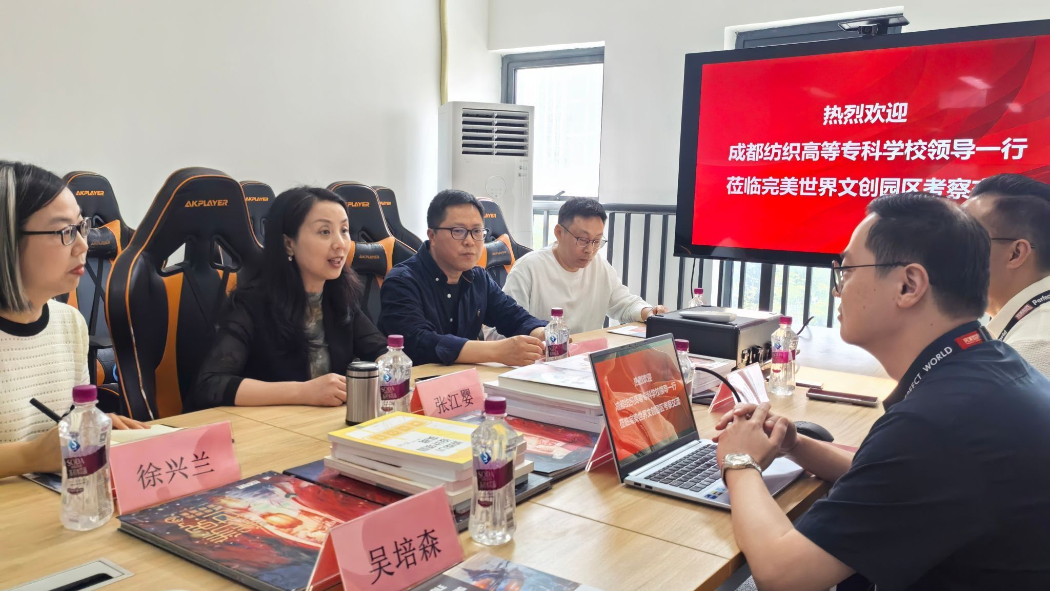 在完美世界教育科技(北京)有限公司西南区域经理孙家龙、杜欢陪同下,调研组实地考察了红仓·完美文创公园,重点调研园区内花吃动漫等企业的运营模式,并就文创产业发展趋势与机遇进行深入交流。座谈会上,张江婴详细介绍学校办学特色,强调了成纺学子“能吃苦、善创造、技艺精”的特质,提出了“从专业建设、课程开发到师资培养、实习就业,实现全链条资源共享,精准对接产业需求”的合作构想。孙家龙高度评价学校的文化底蕴与执行效率,表示将全力配合办好4月18日至20日的2025年“AIGC数字艺术”高级研修班,期待通过校企深度合作,构建“教育推动产业升级、产业反哺人才培养”的良性循环机制。