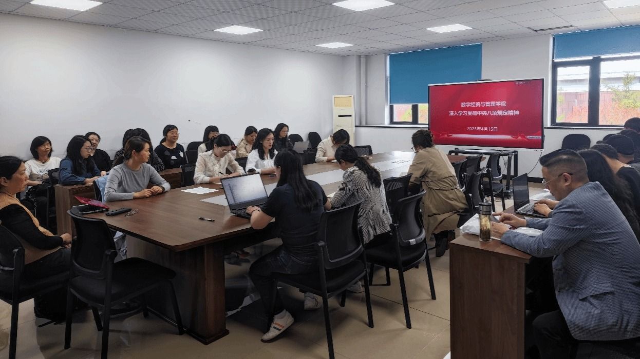 4月15日,数字经贸与管理学院在学院会议室召开深入贯彻中央八项规定精神专题学习会。学院党总支副书记何酉宁主持并领学,全体教职工参加会议。