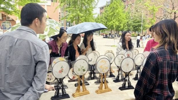 展览中,单面绣佳作《孔雀》以蜀绣传统晕针技法为笔,精妙勾勒出版画般的层次肌理,刚柔并济的针脚将孔雀翎羽的华美展现得淋漓尽致。双面绣《洋葱熊猫》大胆突破传统双面绣的题材边界,将憨态可掬的国宝熊猫与充满生活气息的洋葱元素巧妙融合,灵动鲜活,趣味横生,令人眼前一亮。一幅幅展品独特的创意、精湛的绣工相得益彰,引得参观师生纷纷驻足,赞叹之声此起彼伏。