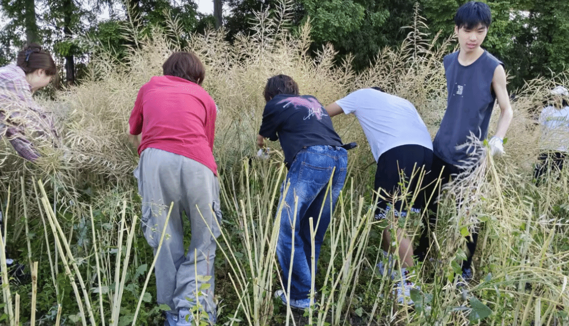 金浪翻涌的油菜田间,师生团队有条不紊地开展收割作业。镰刀起落间,青年学子躬身实践传统农事技艺,在收割、打捆、运输、清秆的完整劳作链条中,切身感受“晨兴理荒秽,带月荷锄归”的农耕真谛。学院党总支副书记张亚茹、专职辅导员景秋萍全程示范指导,将思政教育融入田间教学,以实际行动践行“五育并举”育人理念。