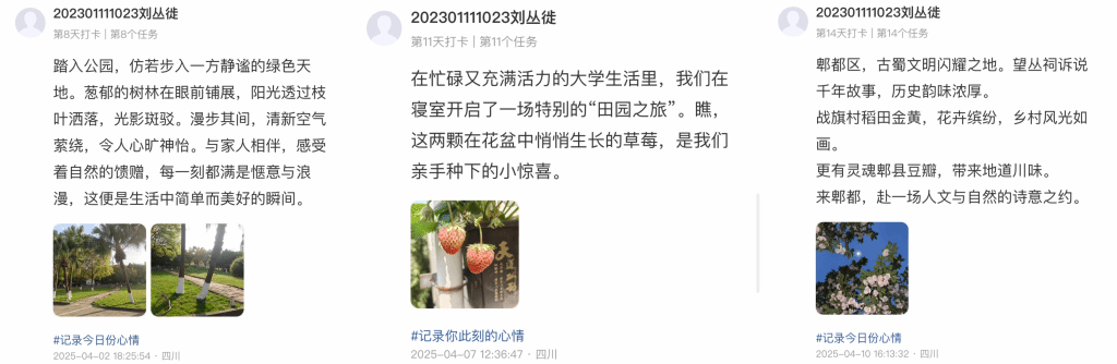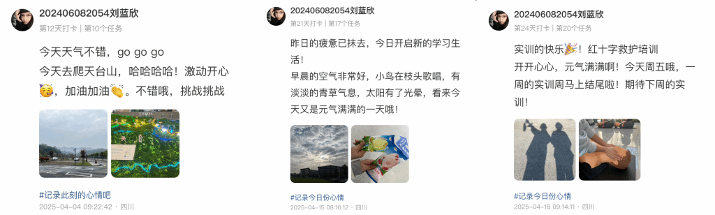 作为2025年“5·25”心理健康教育宣传月系列活动之一,为提升学生情绪管理能力,学校心理健康教育中心于4月启动“以情绪为笔,共绘心灵四季”心理晴雨表打卡活动。活动期间,学生通过文字、图片、歌词等形式记录每日情绪,并分享运动、手工陶艺、冥想等多样化情绪调节方法。