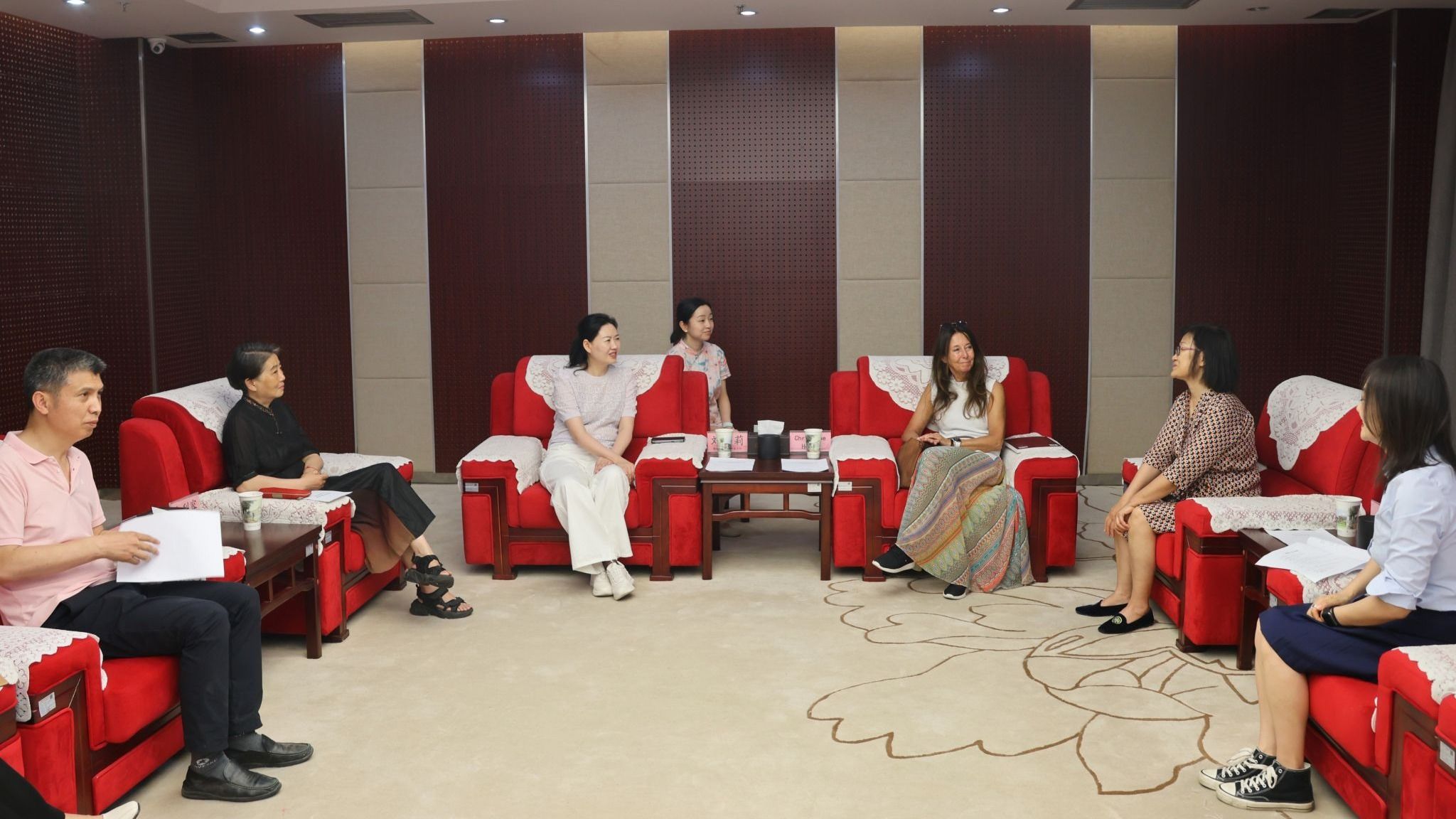 随后,双方在图书馆会客室进行座谈交流。刘莉与克里斯蒂娜·海瑟教授再次围绕“织绣技艺非遗数字化保护与传承如何与国际接轨”展开了深入探讨。