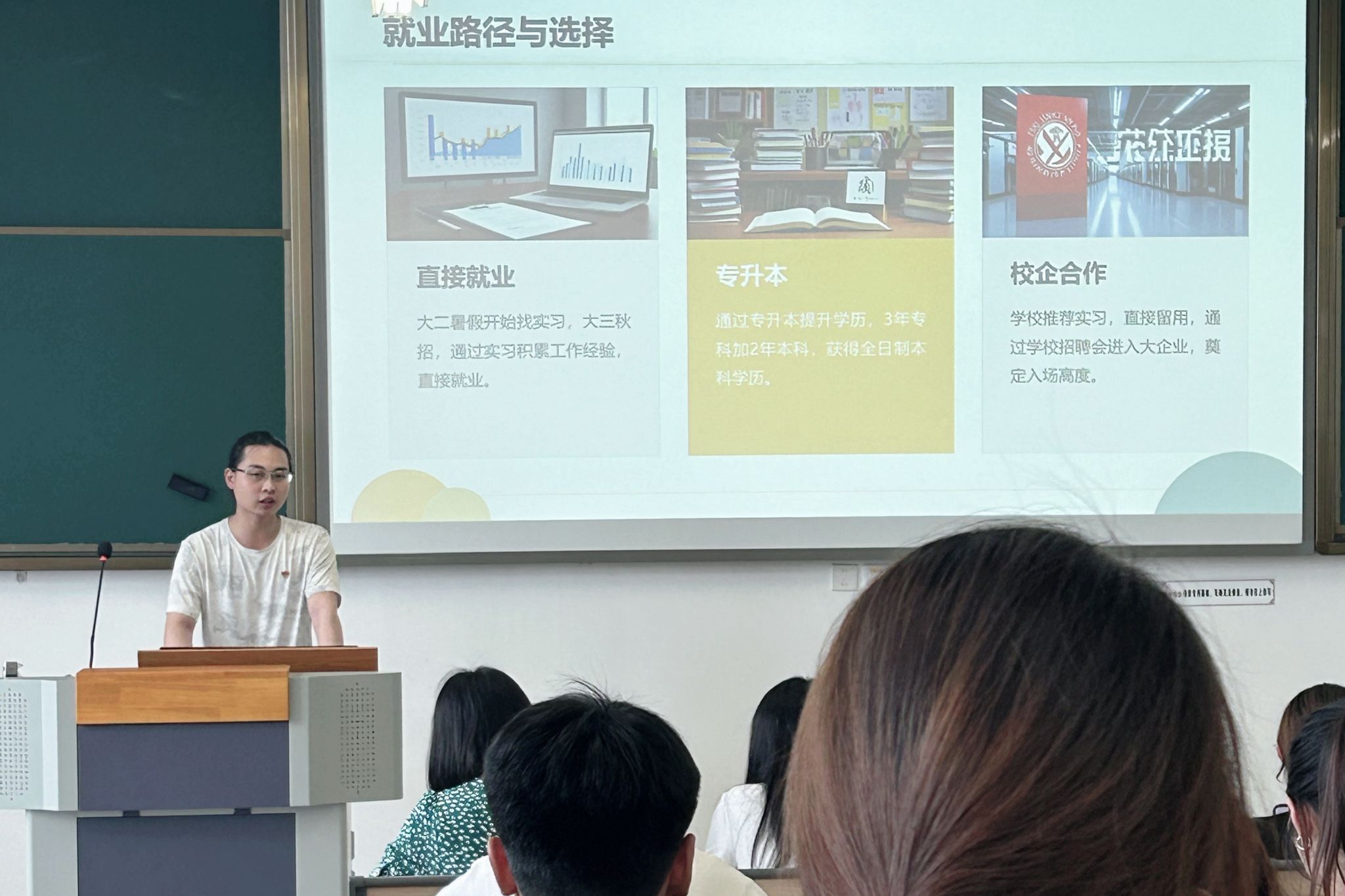 在就业分享环节,入职中国核工业二三建设有限公司的孙鹏从求职前准备、信息收集、简历制作、面试技巧、就业路径等方面展开分享。他强调,专科生实操技能强,深得企业青睐。同学们在校期间要学好专业知识,积极参加实习实训,充分利用学校、学院提供的实习、就业资源,逐步积累工作经验,最终成为一名合格的高素质技术技能人才。