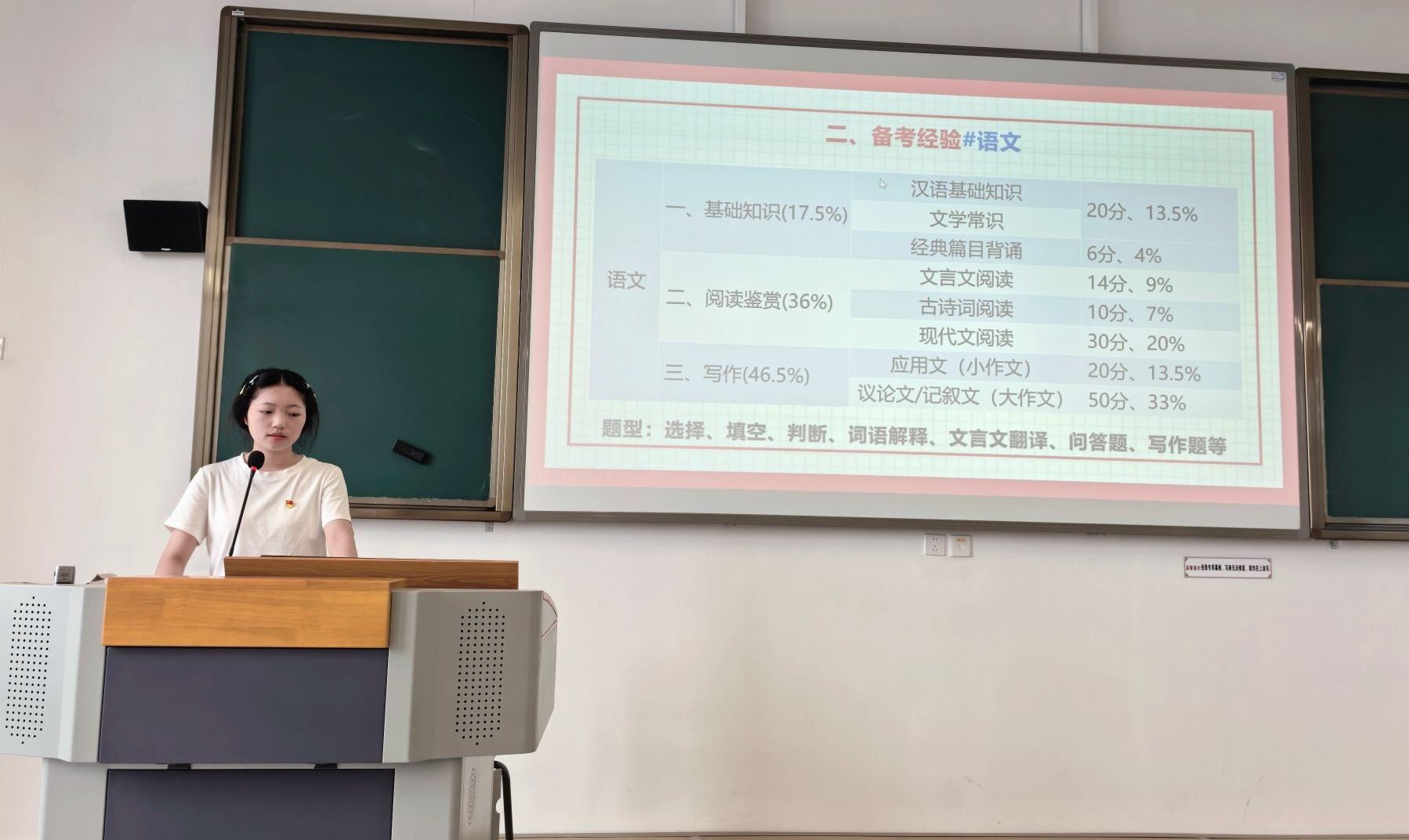 在升学经验分享环节,成功考入四川轻化工大学的邓秋梅从四川省专升本报考条件、考试科目、报考流程、免试政策、加分政策等方面进行了详细介绍,帮助在座同学们清晰认识到了大学成绩和综合素质的重要性。她分享了语文、英语、计算机三个具体科目的备考经验,并总结出谐音构句法、联想法、画图法、实践法等高效复习方法。她鼓励学弟学妹们,一定要合理安排作息,制定科学复习计划,适时调整心态,保持自律与坚持。