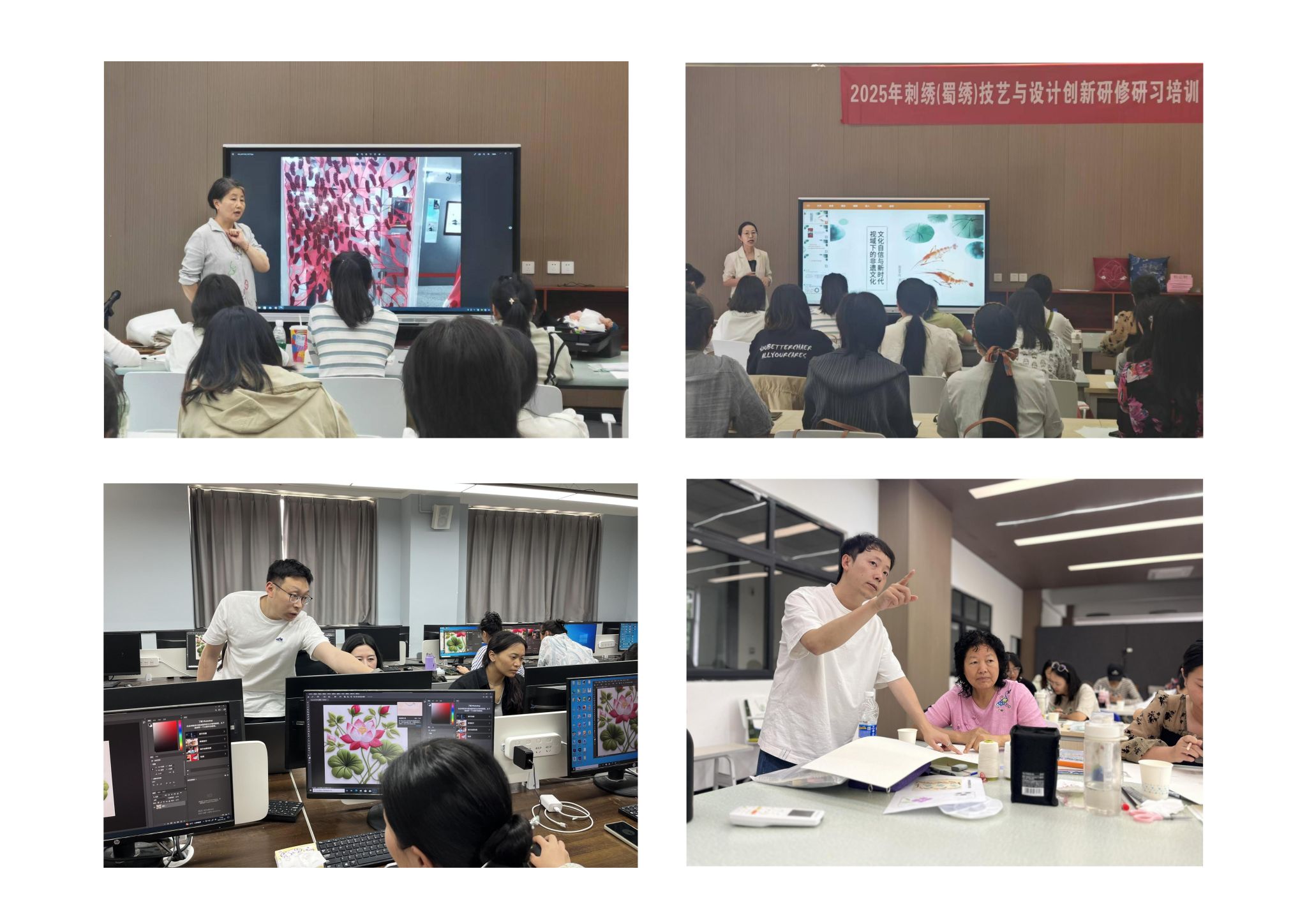 本次培训旨在提升蜀绣非遗传承人及从业者的创新设计能力与制作技艺,强化蜀绣非遗的保护、传承与创新发展动能,培养一批蜀绣针法精进又具备设计转化能力的复合型人才,推动蜀绣艺术在家居装饰、服装配饰、文创产品等广阔领域的深度开发与应用创新。开班前夕,学校蜀绣中心教师团队针对蜀绣人才设计与技艺提升需求,以及蜀绣人才发展现状,精心构建五大课程模块:文化艺术理论基础筑牢根基,设计基础激发创意,刺绣技艺与应用深化实操,作品创作实践检验成果,调研交流拓展开阔视野。独特的“学-研-做”培养路径,为传承人群铺设了一条从理论到实践的完整成长道路。