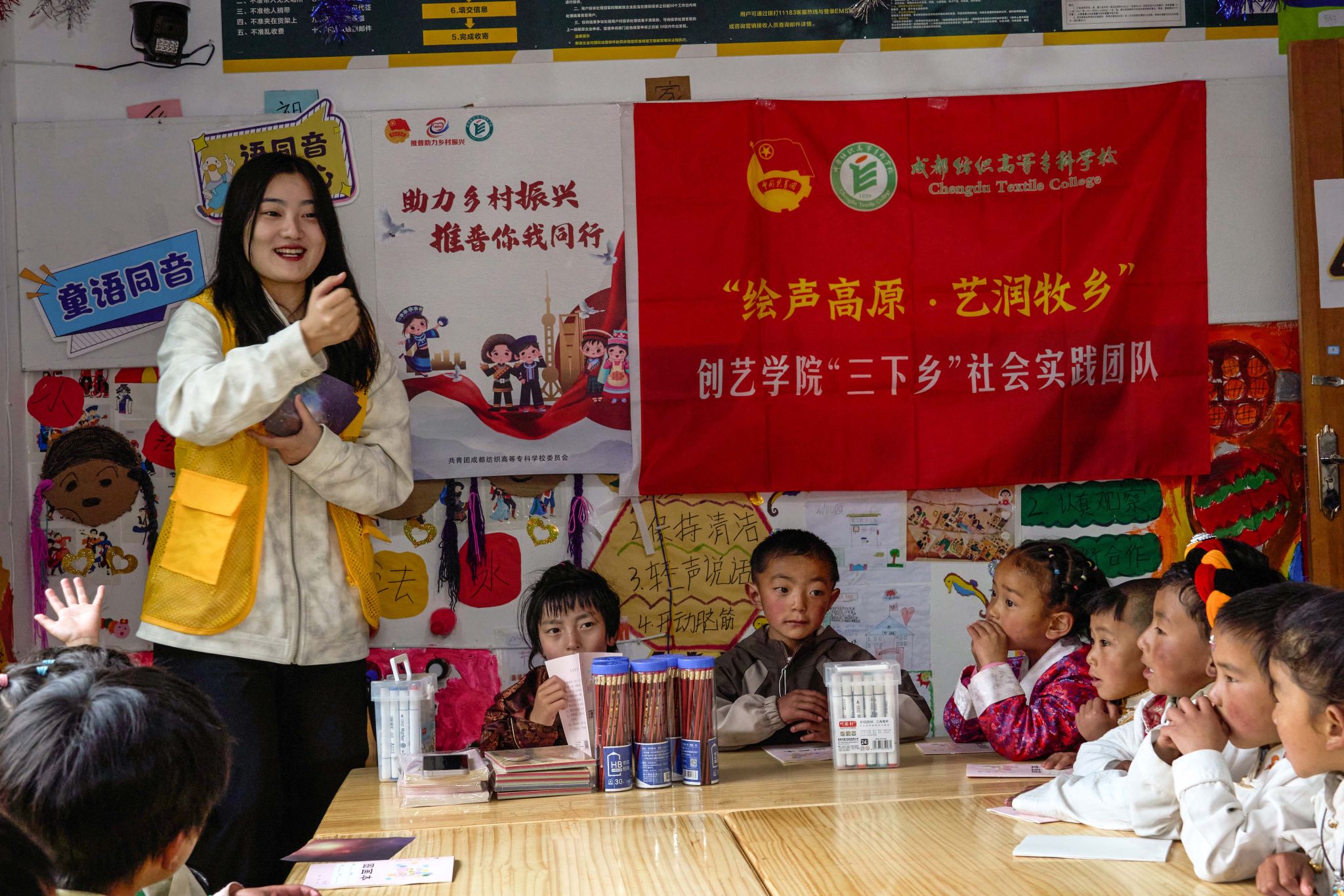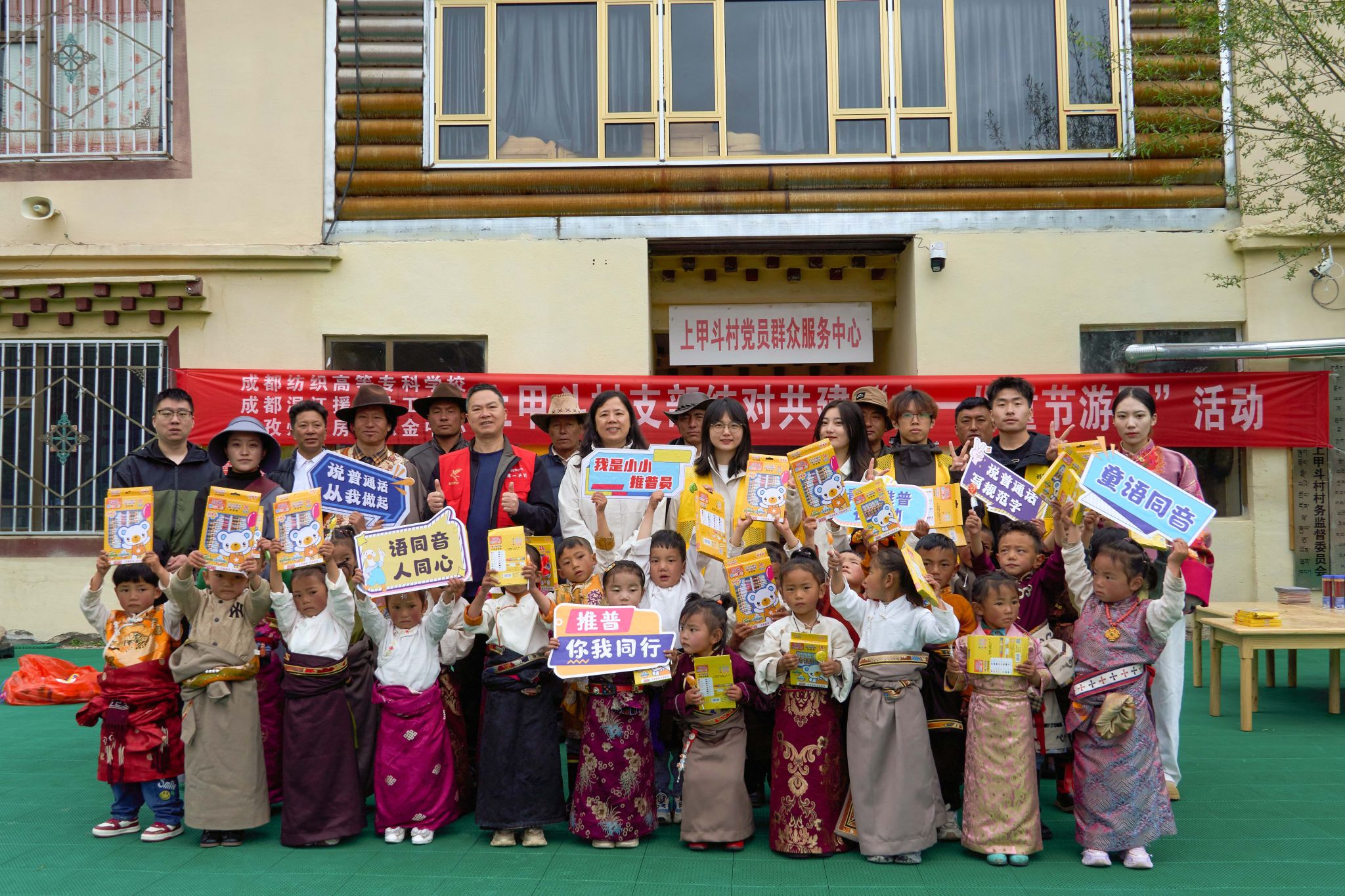 学院师生团队积极响应国家通用语言文字推广号召,以推普助力乡村振兴、铸牢中华民族共同体意识为目标,在上甲斗村和旭日村成功开展多项活动。团队在上甲斗村幼儿园和旭日村村民活动中心举办了两场“推普课堂”、一堂“美术教育”课,通过教授日常用语、绕口令等,有效激发当地藏族同胞学习使用普通话的热情,提升了国家认同感与文化自信。期间,团队还参加上甲斗村支部结对共建活动,为幼儿园提供普通话及文明礼仪培训,向优秀学生发放奖学金和奖品,同时派发普通话宣传资料200余份,切实服务当地发展。
