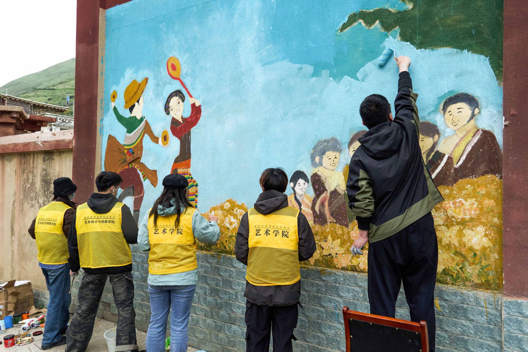 创艺师生充分发挥专业特长,深入色达县旭日村,以画为媒,在海拔3500米的高原,开展共绘民族团结“同心墙”实践活动。师生克服高原寒冷缺氧的恶劣环境,凭借坚韧不拔的毅力和信念,在墙面上创作施工,经过持续奋战,以铸牢中华民族共同体意识为主线,包括石榴花和民族团结进步宣传标语等民族团结文化元素的“中华民族一家亲”墙绘作品应运而生。该墙绘作品有效传递了民族团结、和谐共处的正能量,绘画过程中,村民热情驻足观看、打卡拍照。