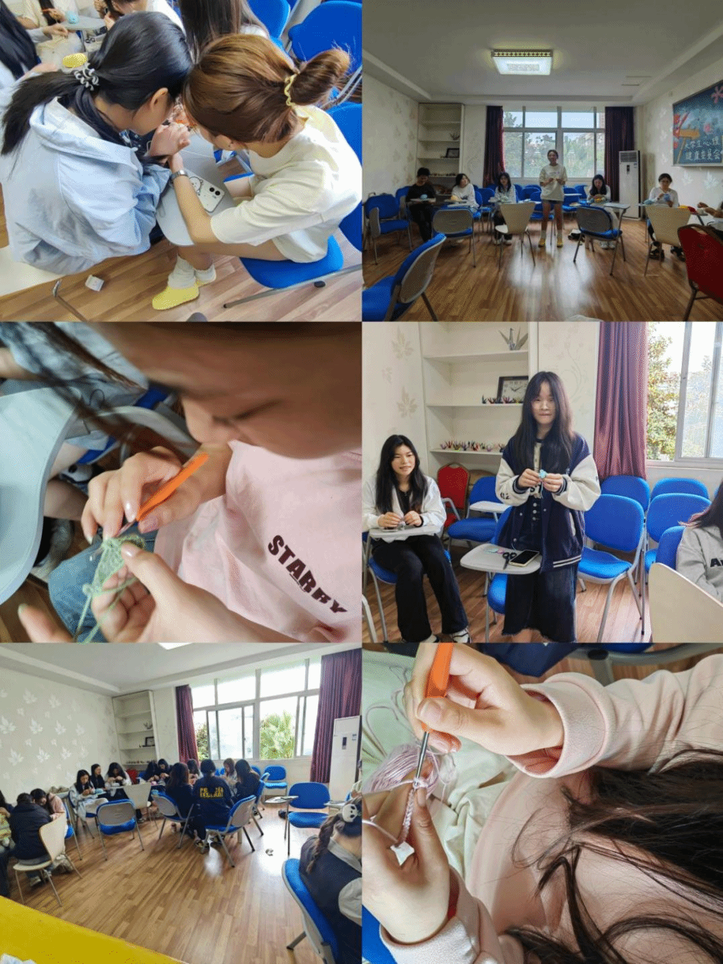 活动面向全校招募,经前测访谈,15名同学参与此次团体活动。在专业引导下,学生们沉浸于钩针技法,通过专注于每一次钩针的起落,协调呼吸、觉察当下,感受毛线在钩针牵引下逐渐成型的奇妙过程。这种深度专注的手工劳动实践,将传统手工艺的“匠心”与心理健康的“正心”相结合,有效提升了参与学生的专注力、抗压韧性和情绪管理能力,对培育积极心态、预防心理问题、促进个体和谐发展起到了积极作用。