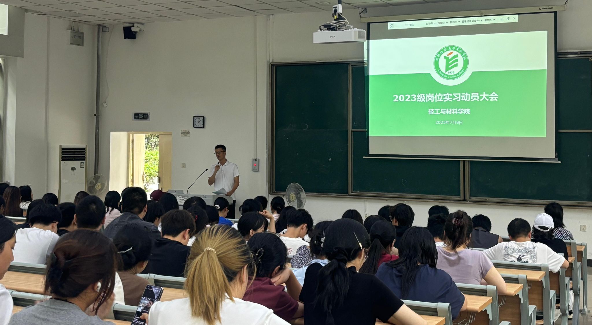 7月8日,轻工与材料学院在致知楼C101召开2026届毕业生岗位实习动员大会。学院党总支书记蒋旎、党总支副书记雷春、各专业负责人、毕业班辅导员及400余名毕业生参会,会议由副院长蒋悦主持。