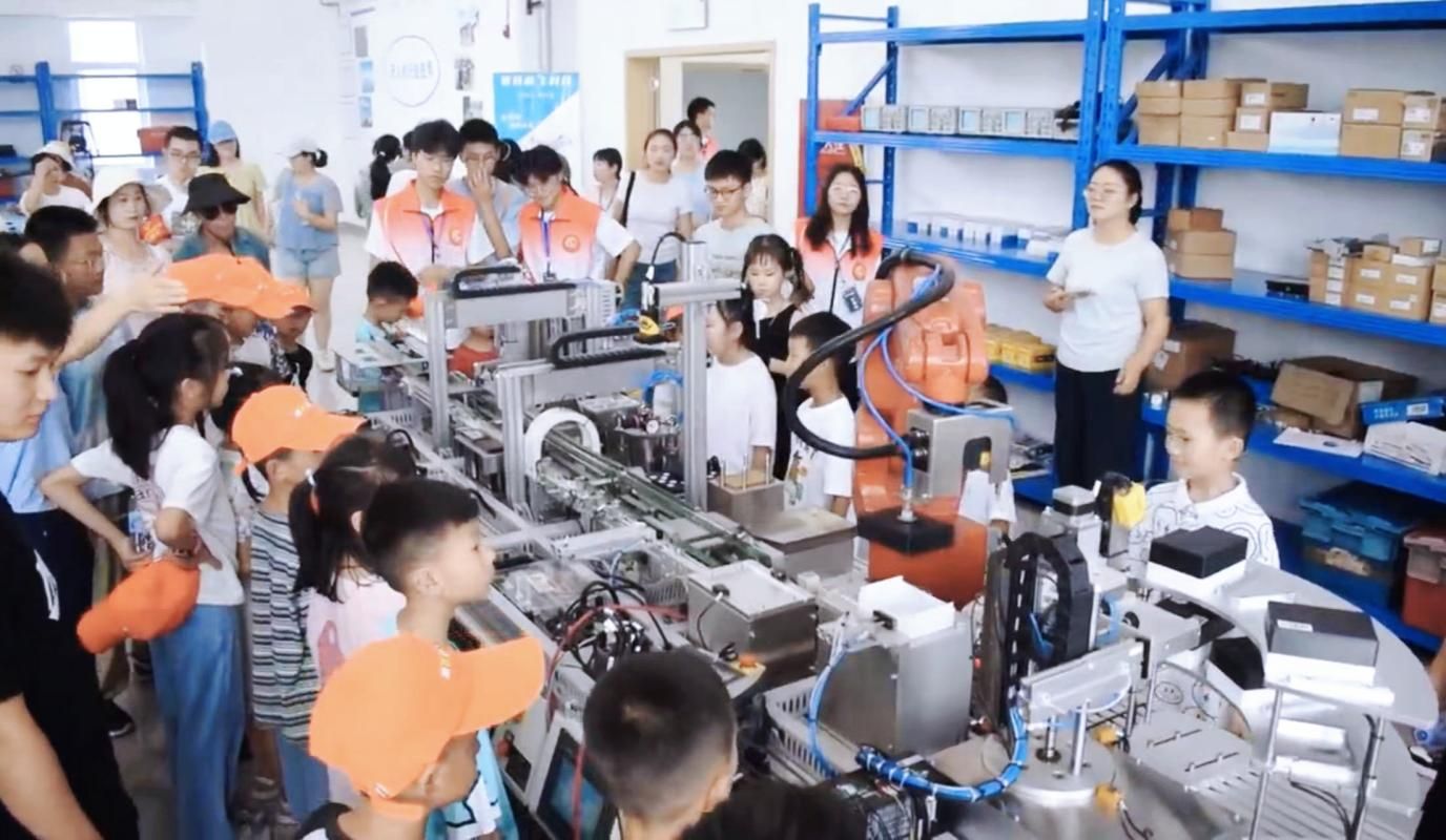 智造学院团总支精心规划研学路线,为孩子们带来了一场充满科技感的智造盛宴。首先是带领孩子们初探汽车维修奥秘,在行知楼汽修实训室,孩子们围在专业设备前,第一次清晰看见汽车的“骨骼”与“心脏”,眼中闪烁着求知的亮光。隔壁电梯实训室为孩子们揭开了现代垂直交通工具的安全运行秘密,将复杂的控制系统化为直观模型,引得大家阵阵惊叹。步入行知楼B101先进智造工程实训中心时,看到智能化生产线在流畅运作,宛如未来工厂的微缩实景,孩子们不禁屏息凝视感受“中国制造”向“中国智造”跃动的脉搏。行程在B303机器人实训中心迎来高潮,灵巧的机械臂精准舞动,完成复杂指令,孩子们兴奋地围拢,小手跃跃欲试,科技的魅力在此刻无声浸润心田。